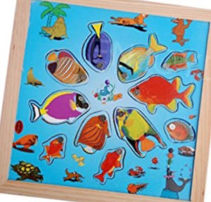 That’s why I love this Wooden Magnetic Fishing Game. There’s still a puzzle to be done, but it’s different. You get to use a pretend fishing rod and lift up the wooden (brightly coloured!) fish with the attached magnet to put them in the right shaped/sized space.