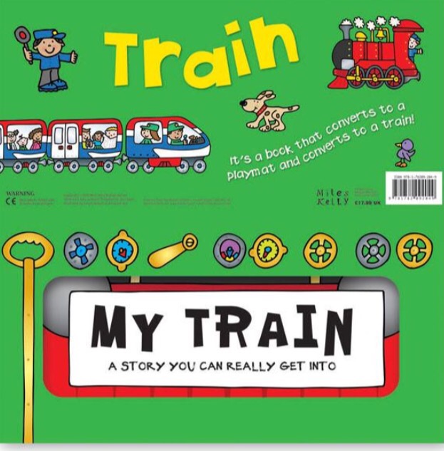 It’s a short story book written by Amy Johnson about a train journey, with eye catching illustrations by Simon Abbott. But, it’s not your ‘run of the mill’ train book! Not only does it open out to be a play mat for train/car toys but it can be (easily) built into a cardboard train that your child can sit in and pretend to drive!
