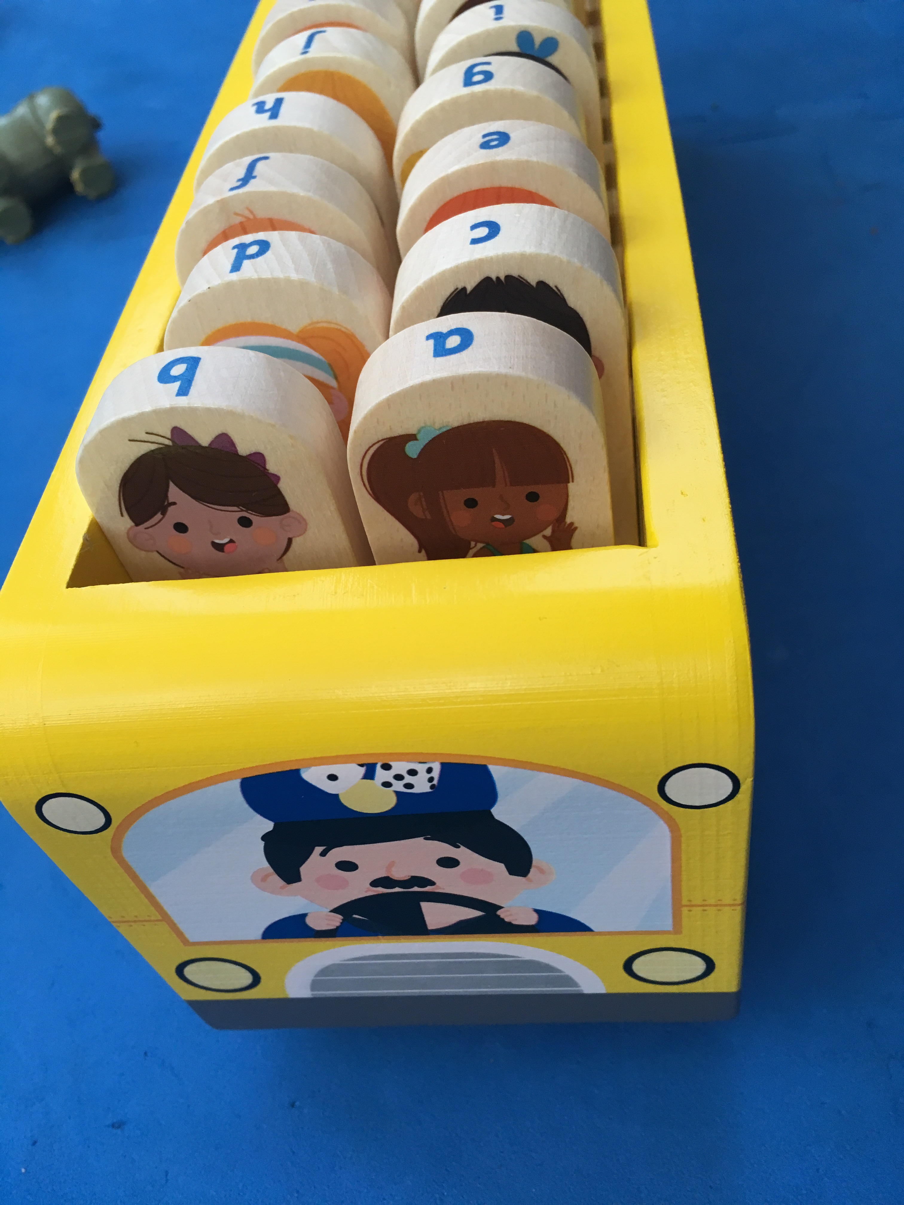 Each piece fits neatly in its matching letter slot ‘seat’ in the bus.