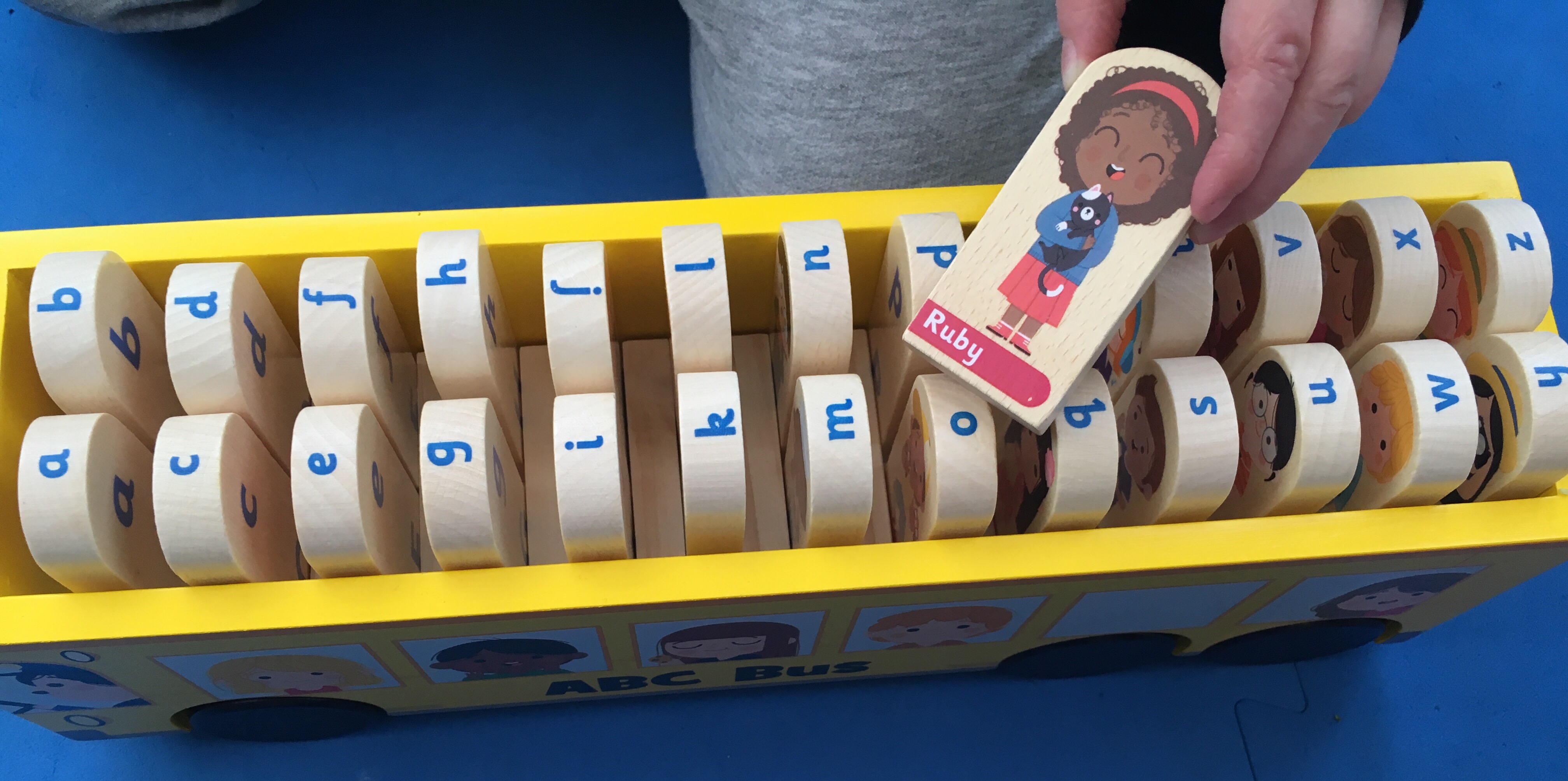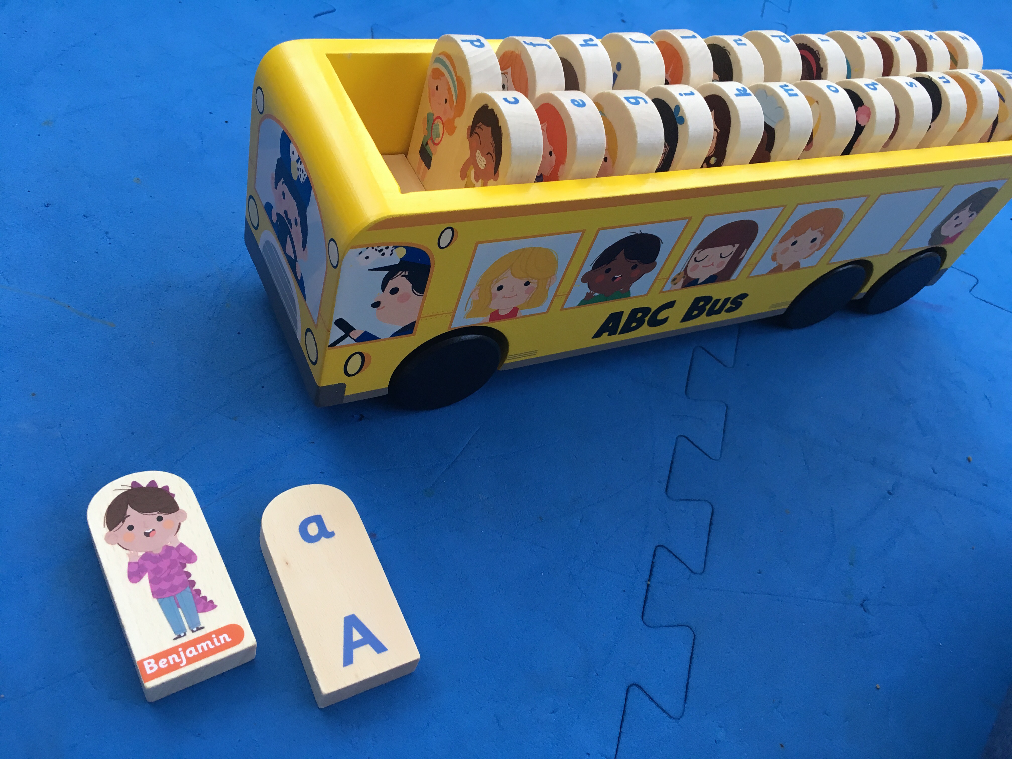 Made of wood, this toy bus contains 26 wooden ‘children’ with names and pictures on the front and their corresponding letter of the alphabet on the reverse.