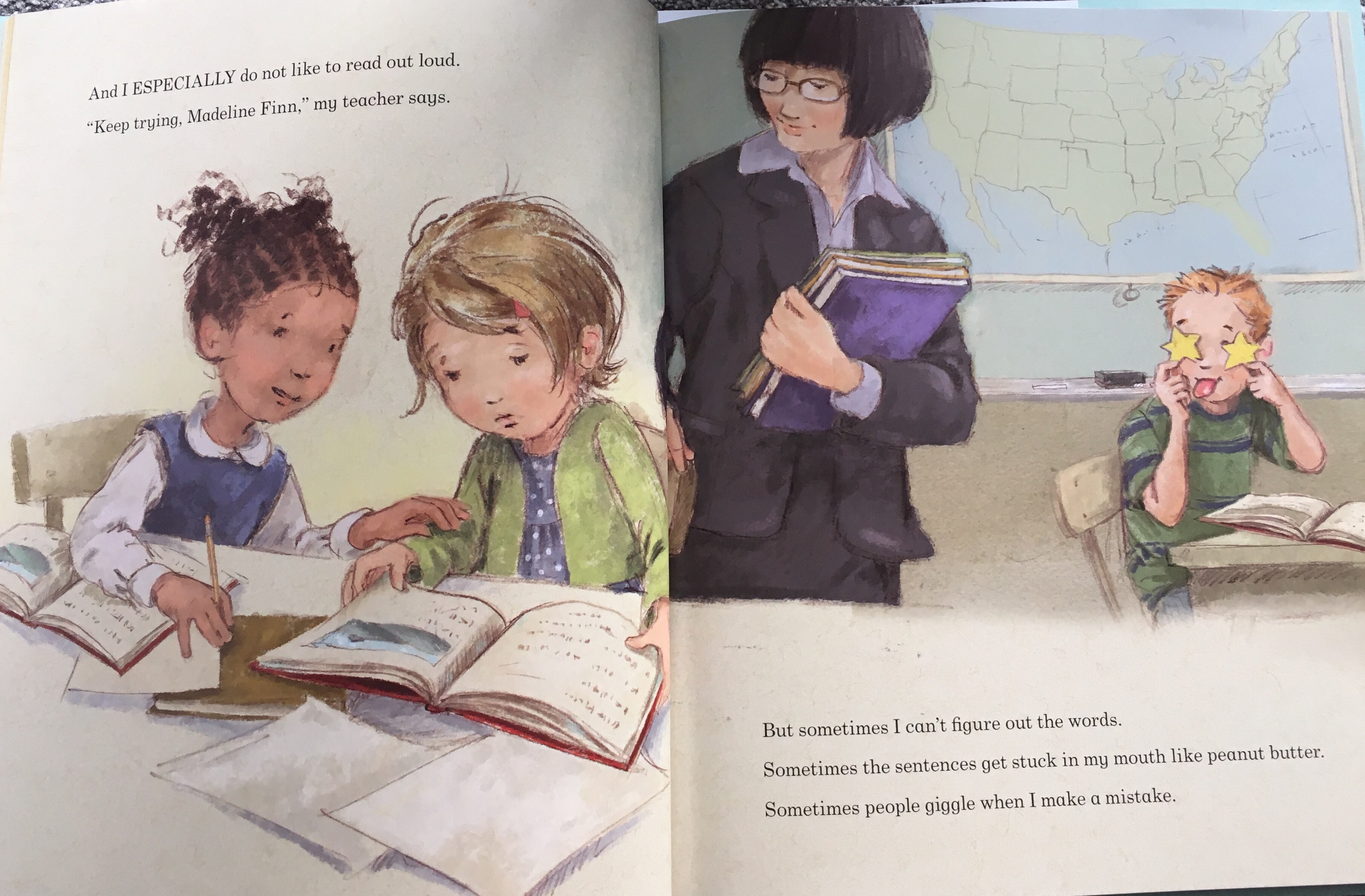 - Strategy for Dealing with Anxiety– Many children (and lets face it..adults!) find reading out loud daunting. Madeline is taught to imagine she is just reading to Bonnie (a dog), who she feels comfortable reading to. A great strategy for other children to adopt.