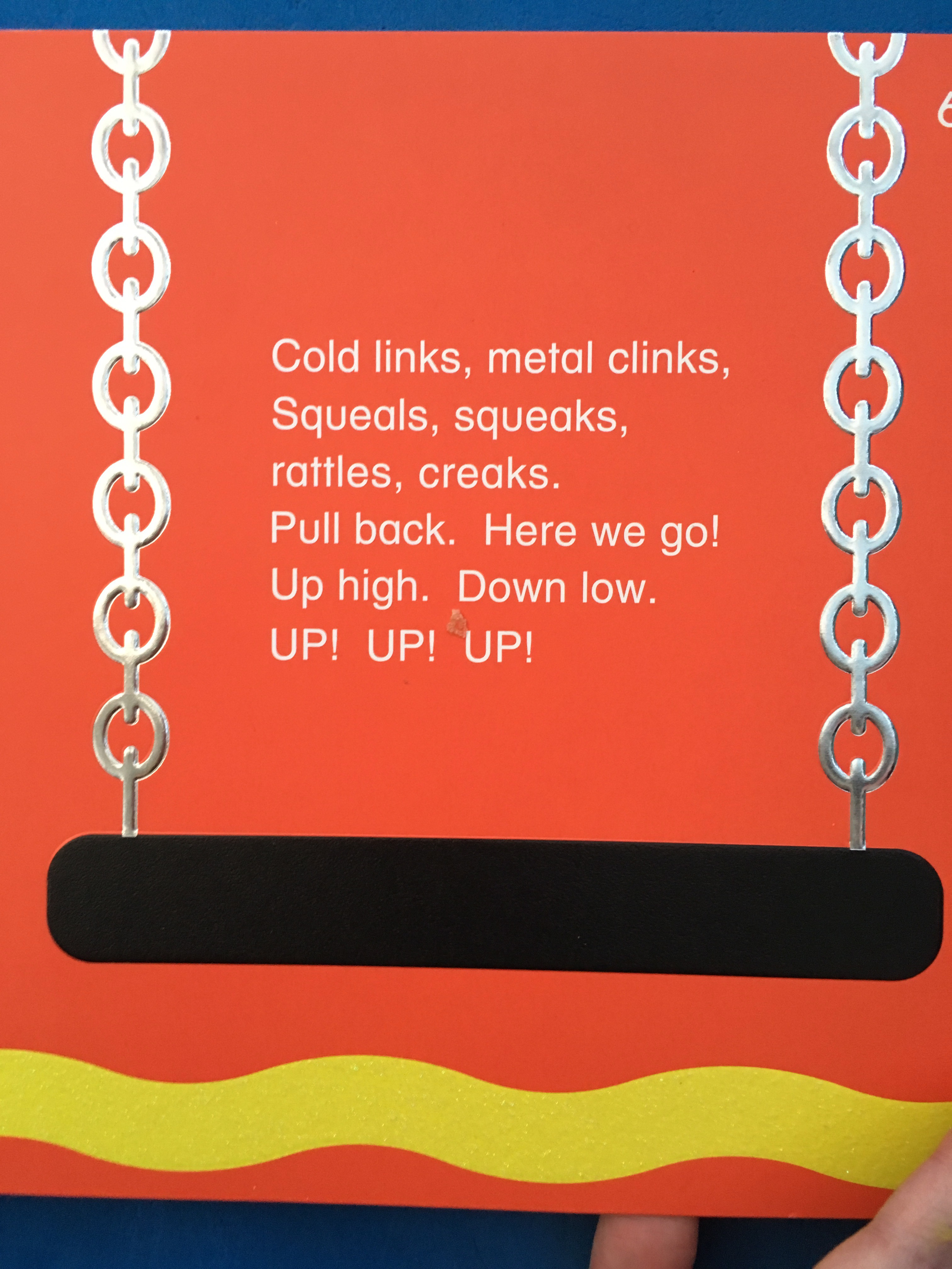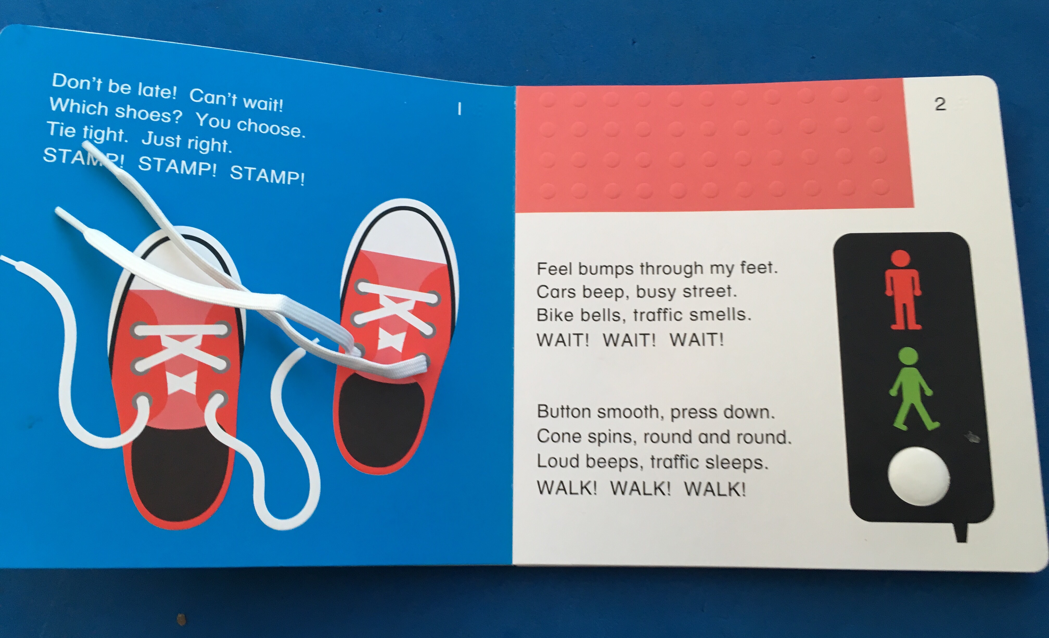 - Range of Tactile Elements- I can’t stress enough how fantastic the tactile elements (touch and feel sections) in these two books are. They are absolutely incredible! In Off to the Beach there’s everything needed to fully imagine a day at the beach, including squishy wetsuits, shiny sunglasses and rough sand to pretend to jump in. In Off to the Park there’s ACTUAL shoe laces to tie (!), rough metal steps on the slide to feel and even the button on the Pelican Crossing to press!