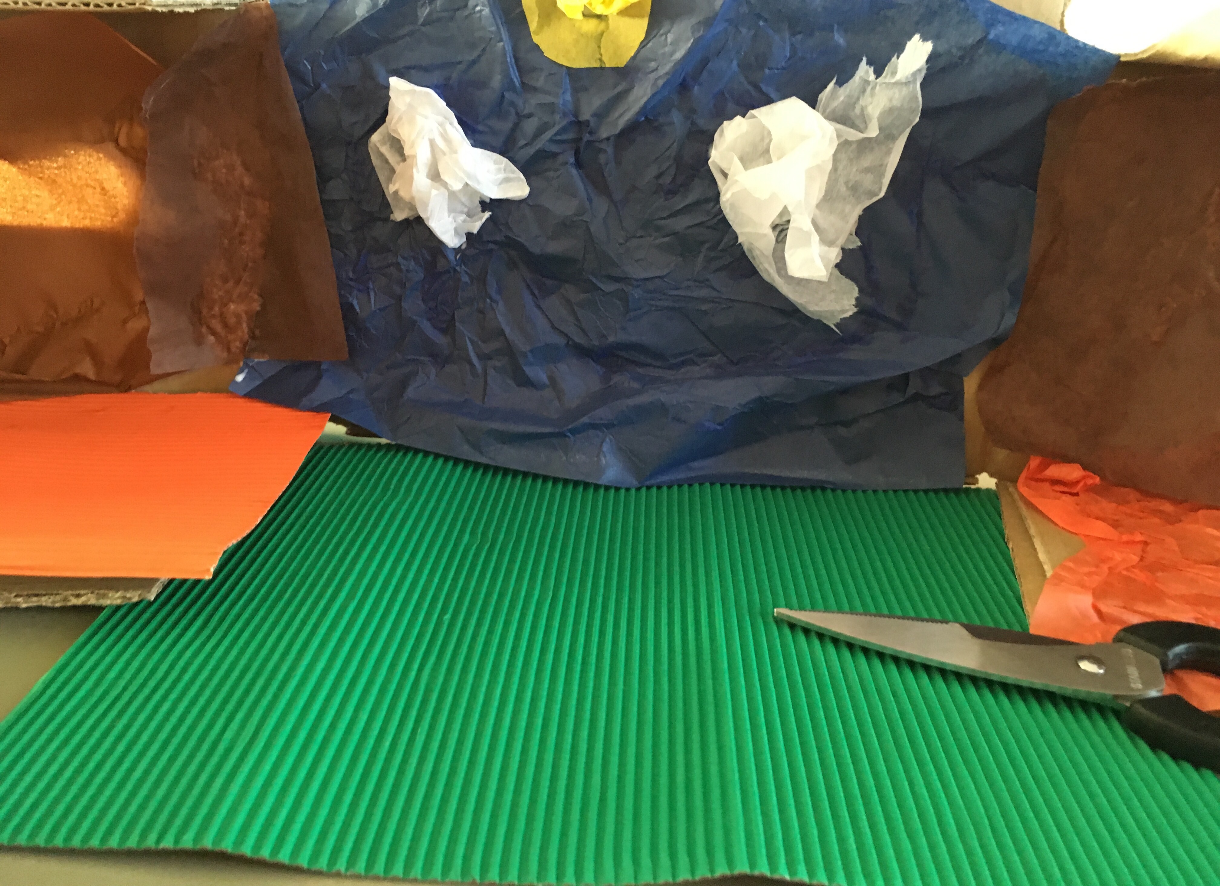 • Create an ‘outdoor space’ by using tissue paper to look like the sky. Use a piece of card for the base, fold it in the middle so that when you want to close the box it folds inwards.