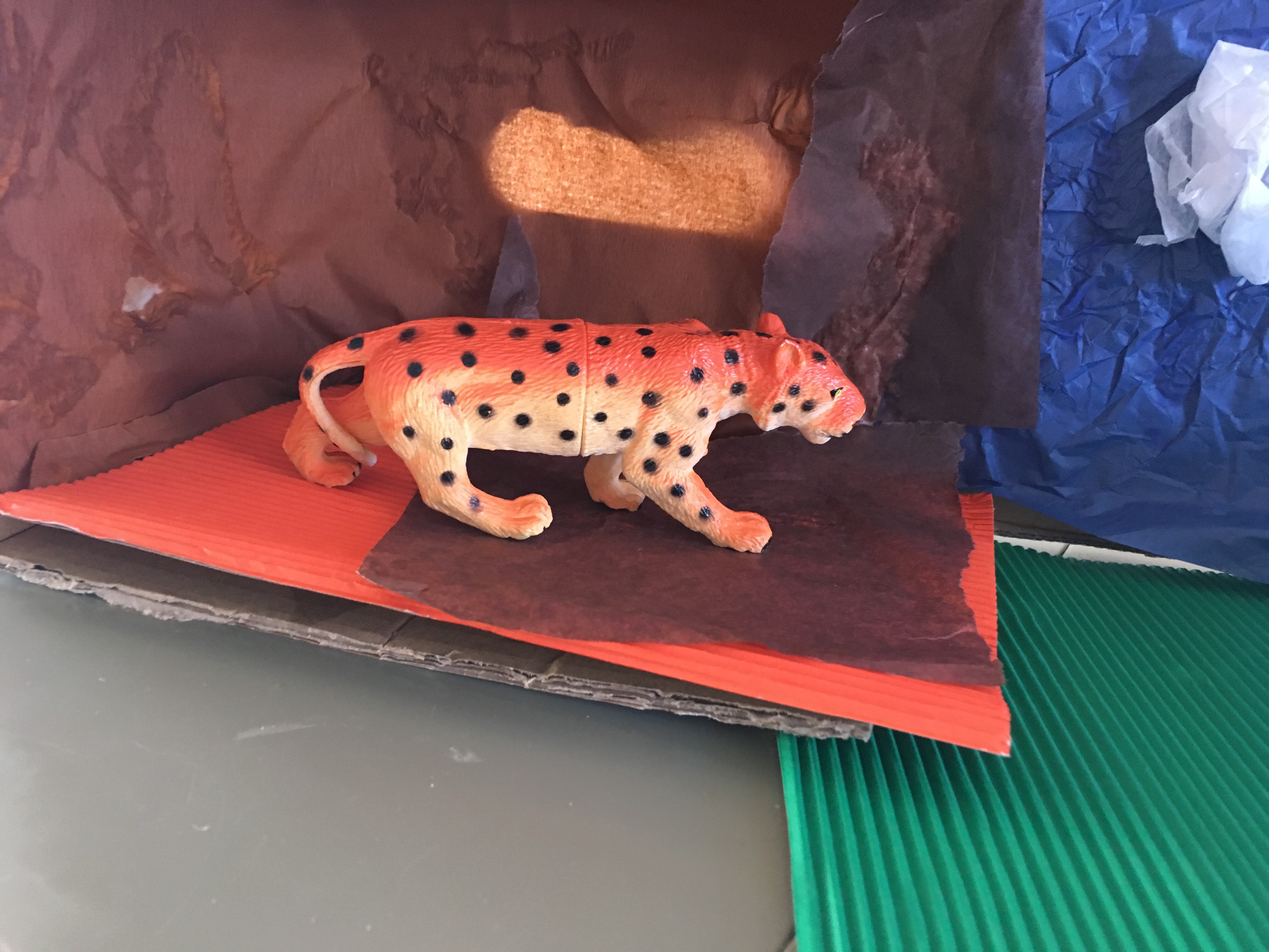 • Glue tissue paper, card etc onto the walls and floor of the box to create different places for the toy animals to ‘live’