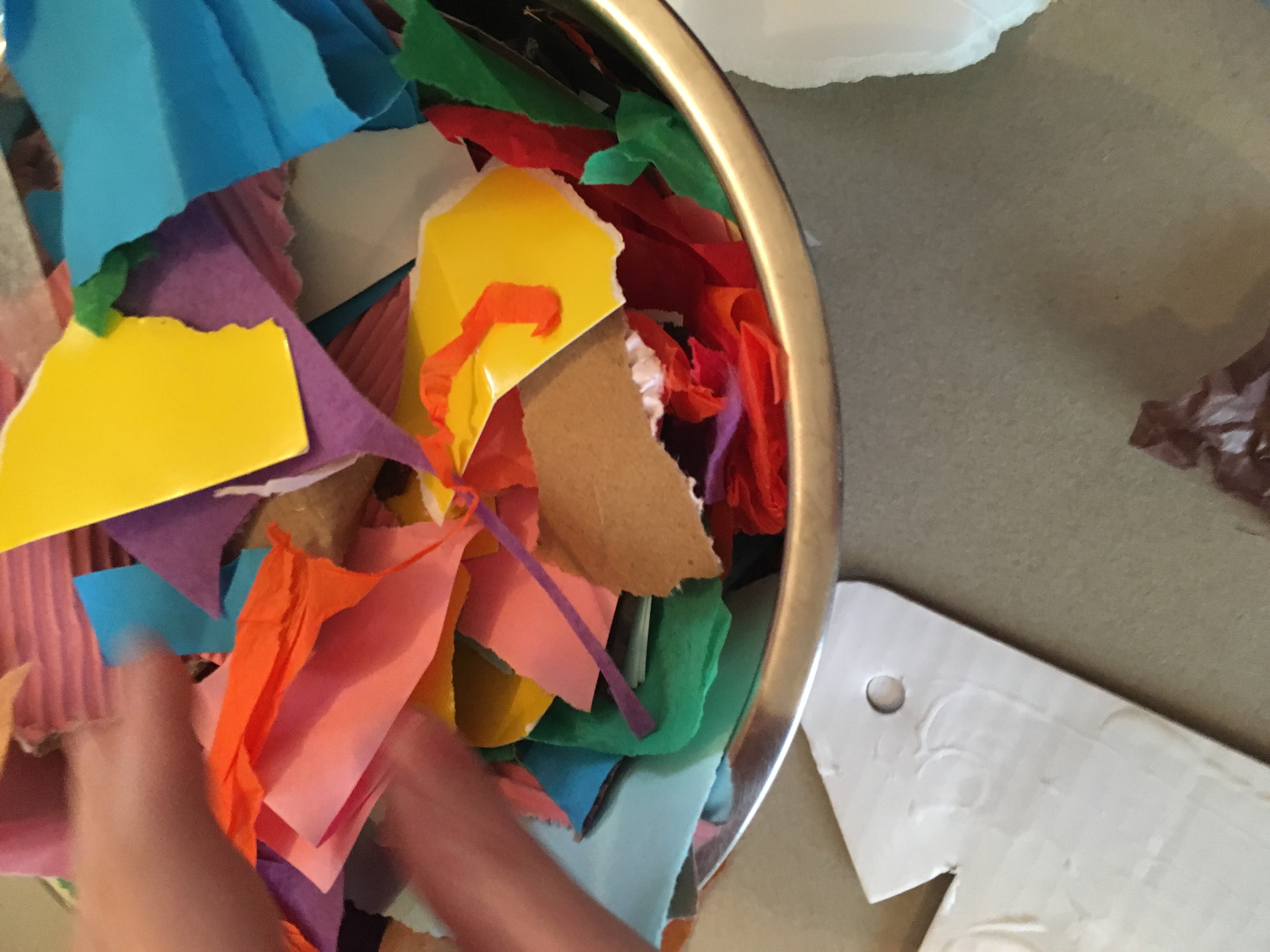 - We ripped and cut the paper into irregular, small peices and put them in a bowl.