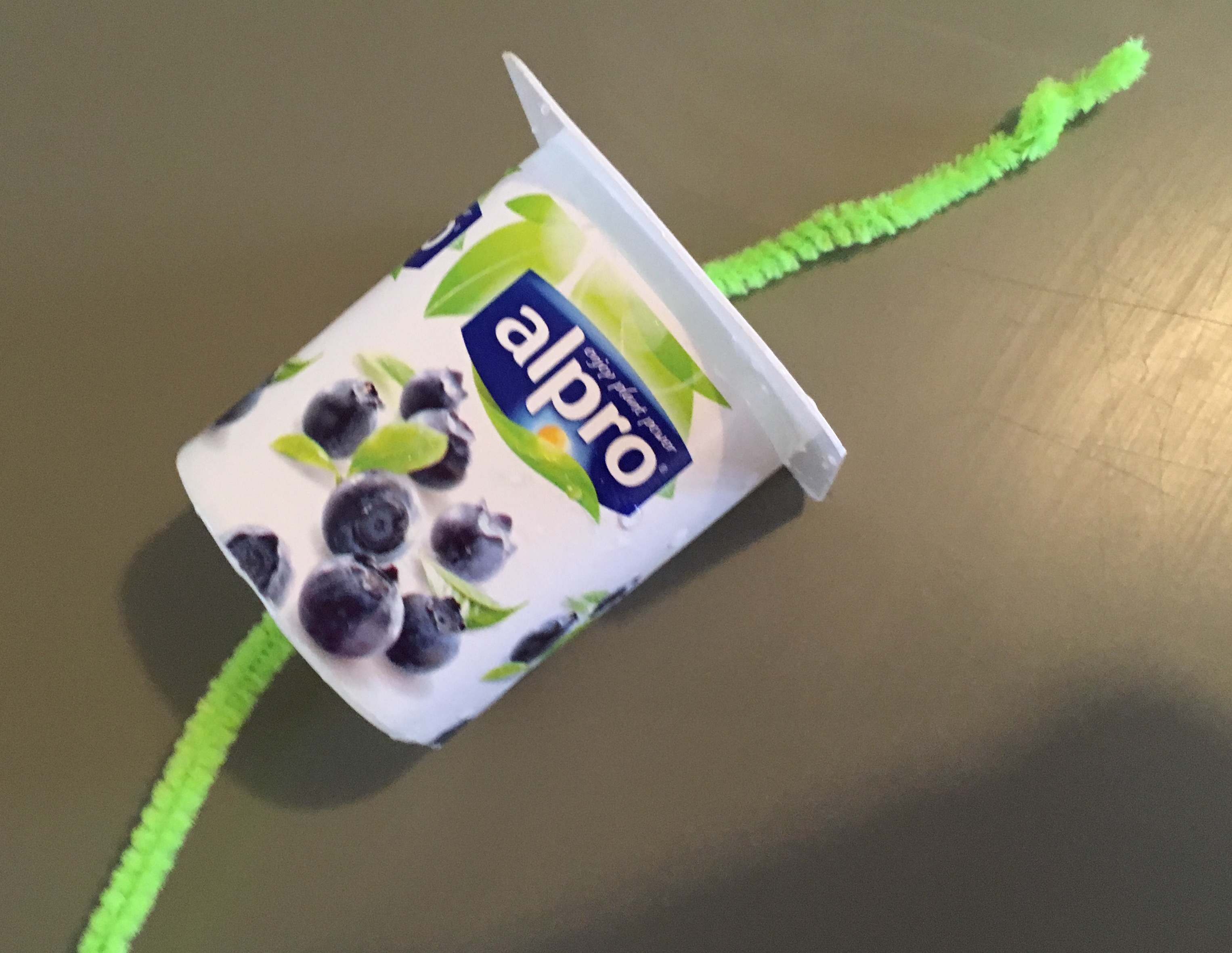 2.Clean the yoghurt pots, adult make a hole in the bottom. Thread pipe cleaner through and tie knot in one end to keep in place.