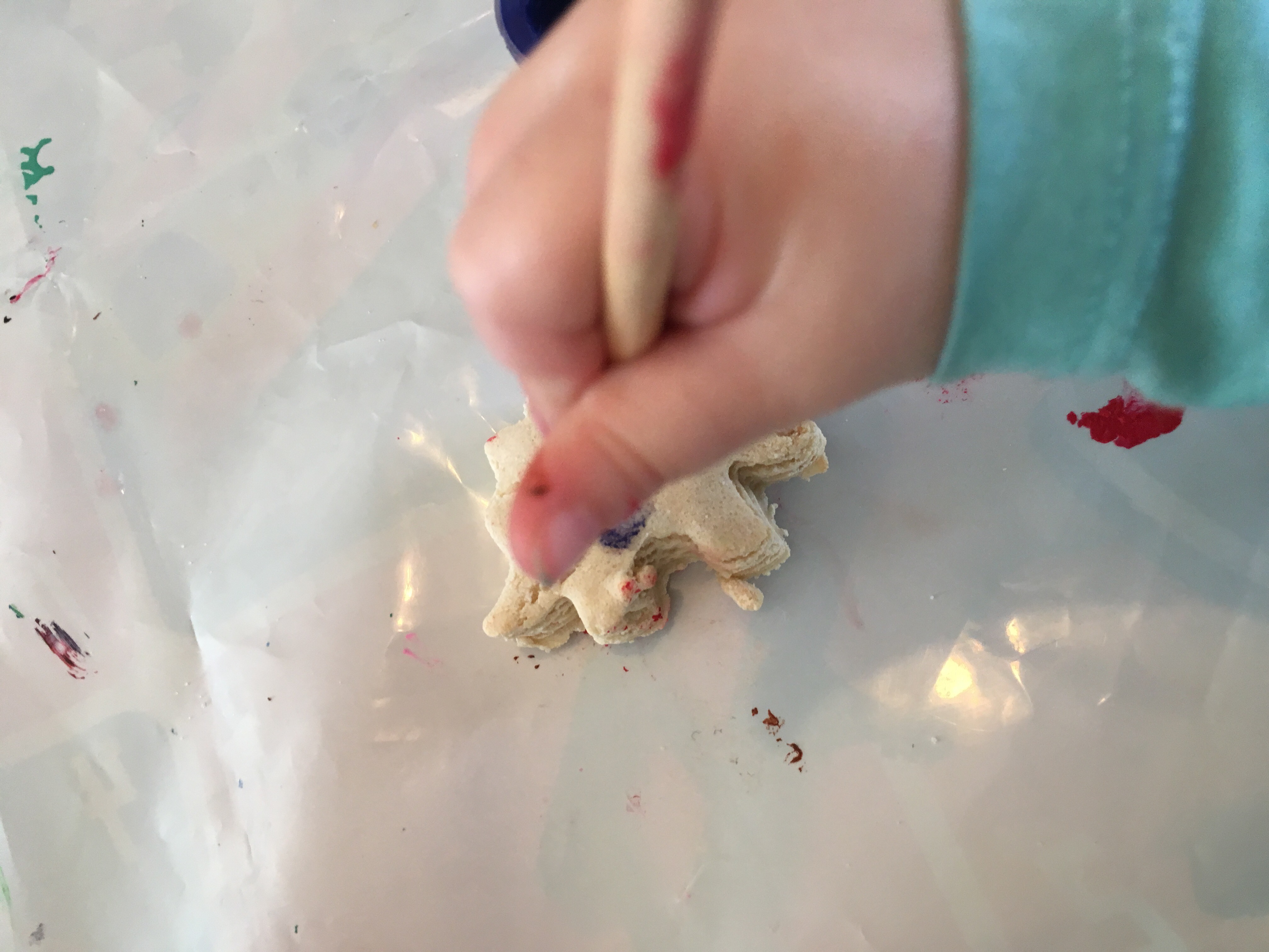 👉What do you do? Instructions can be found here; but you basically mix the ingredients, roll out and cut with the cutters and then put them in the oven, once hard and cool…paint!
