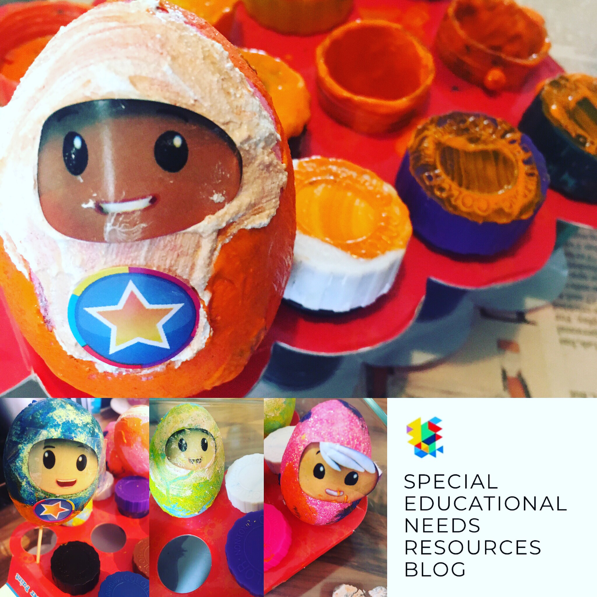 👉 What do you do? Choose your theme. We had some Go Jetters Stickers left over from our magazine so decided to make egg Go Jetters! But you could make little people or simple just decorate. Get to work painting and sticking stickers!