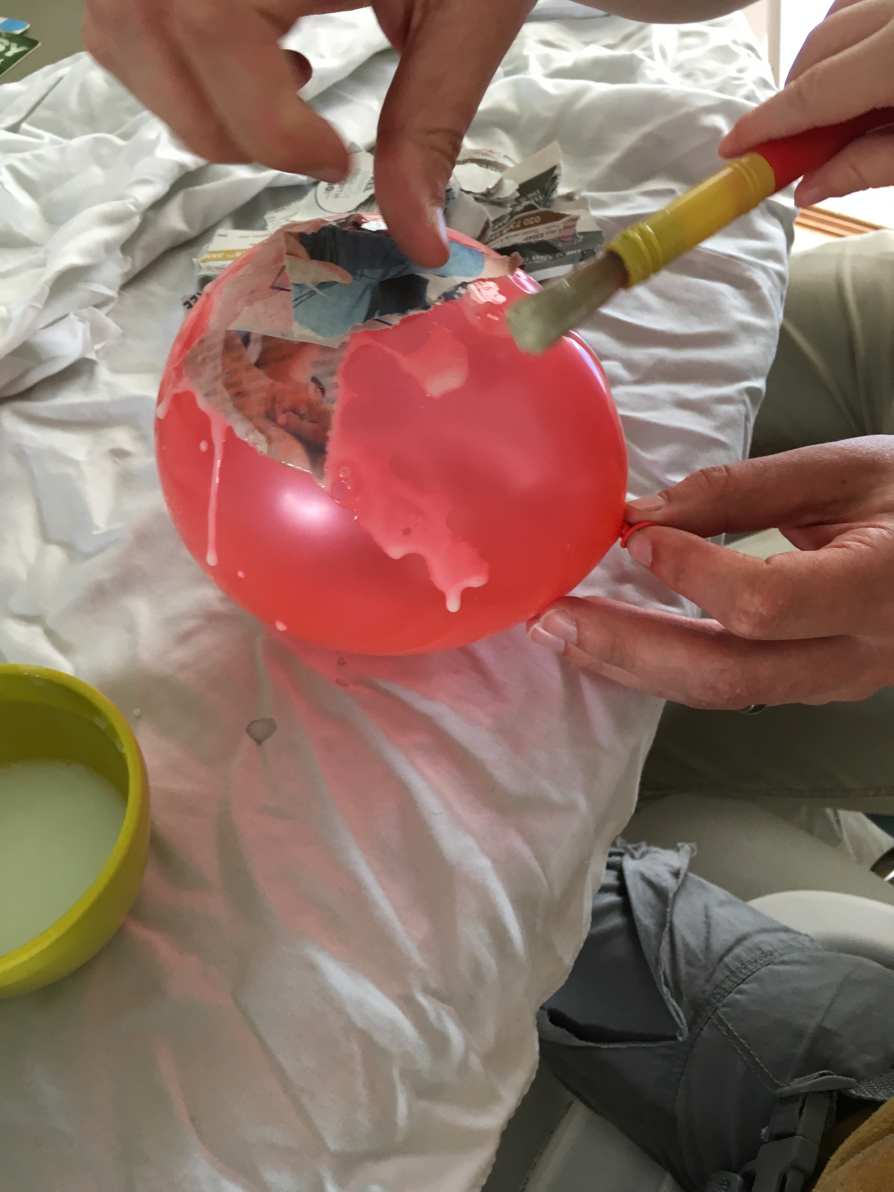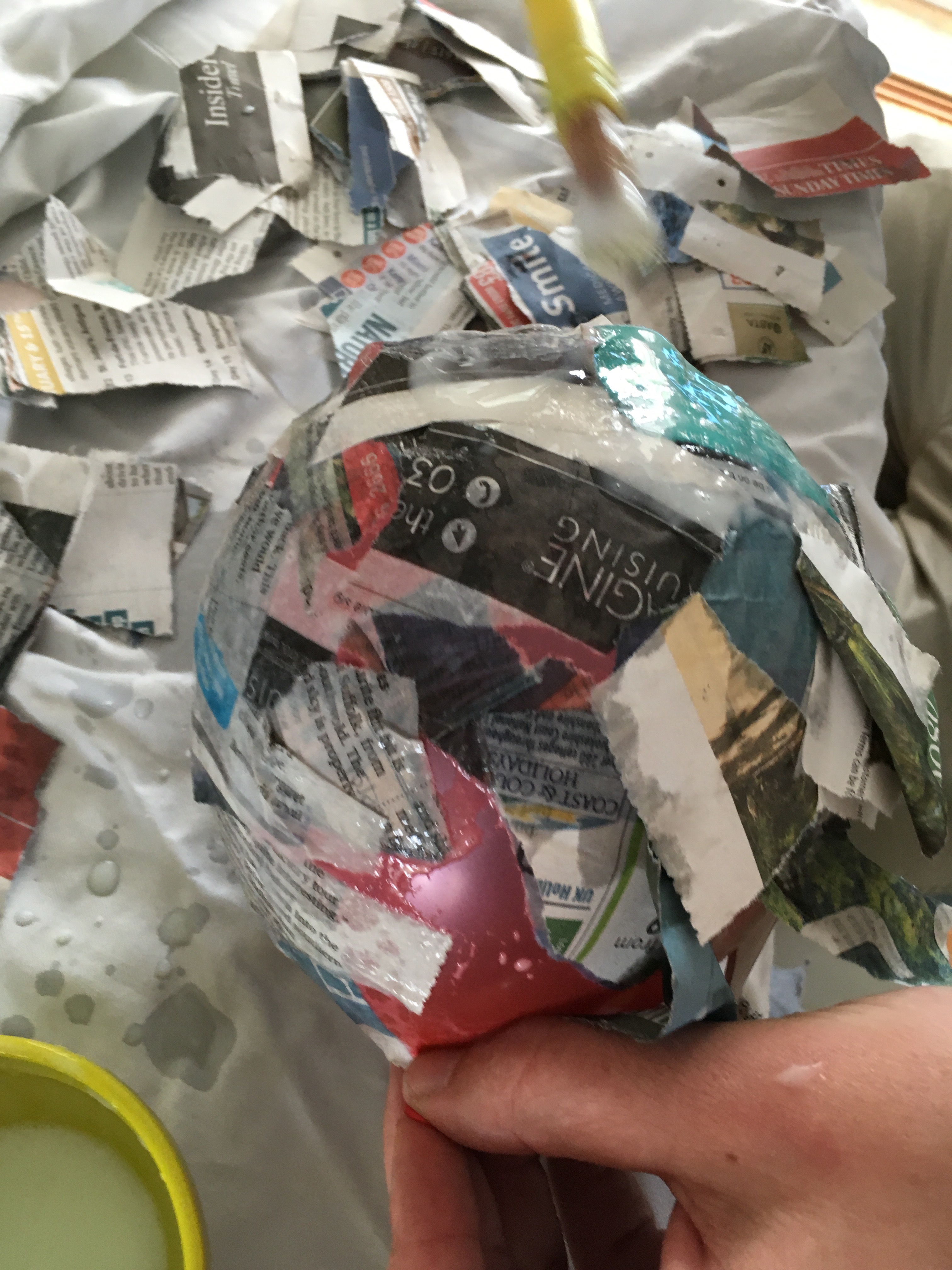 Step 1: Blow up a balloon. Mix pva glue and water together. Put the strips of newspaper/paper on the balloon and cover in the glue/water solution.