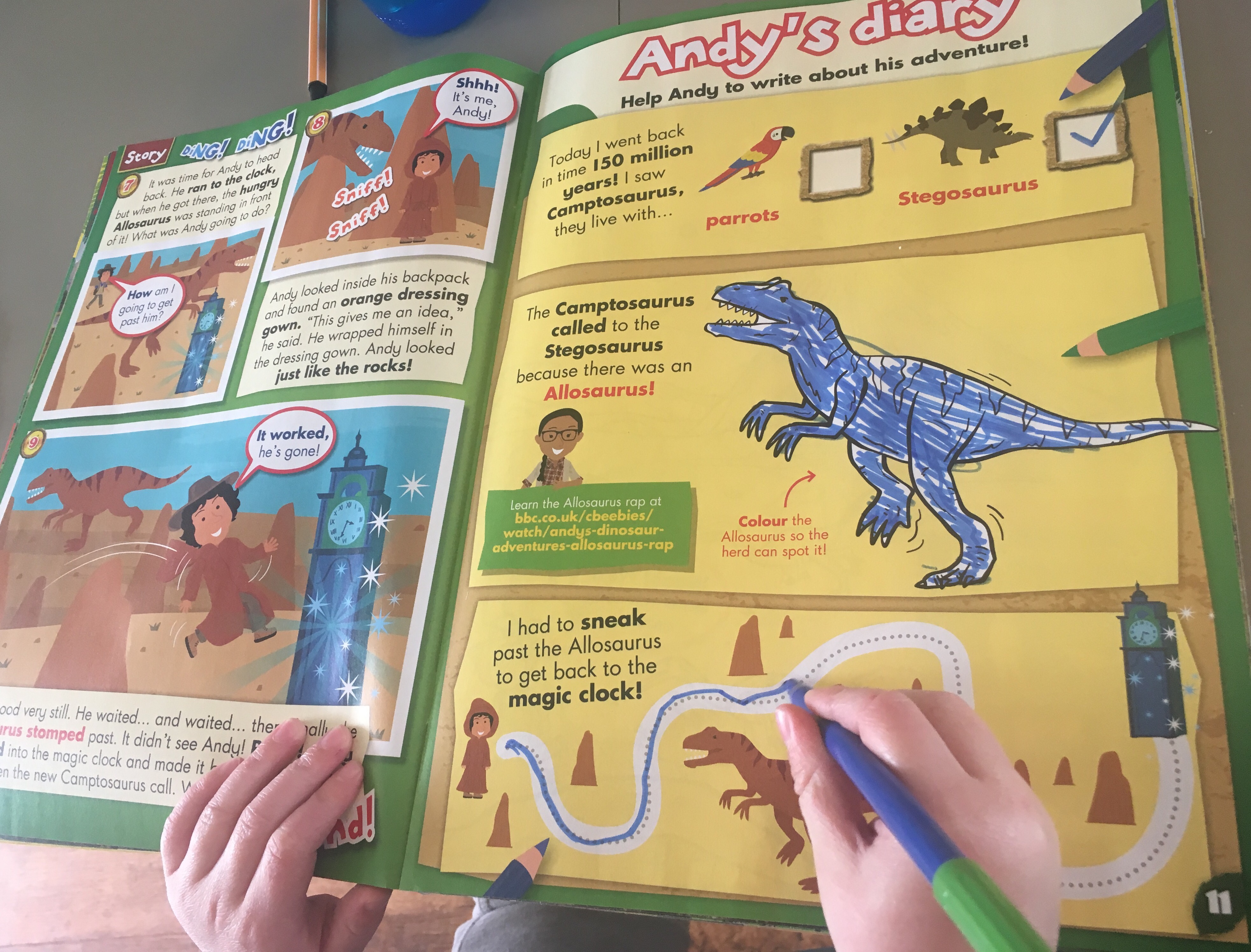 - Exciting Stories: We love the stories, this month’s featured a Camptosaurus and some Stegosauruses! Their stories also include quick comprehension questions, great for checking children’s understanding and having a chat together about the story.