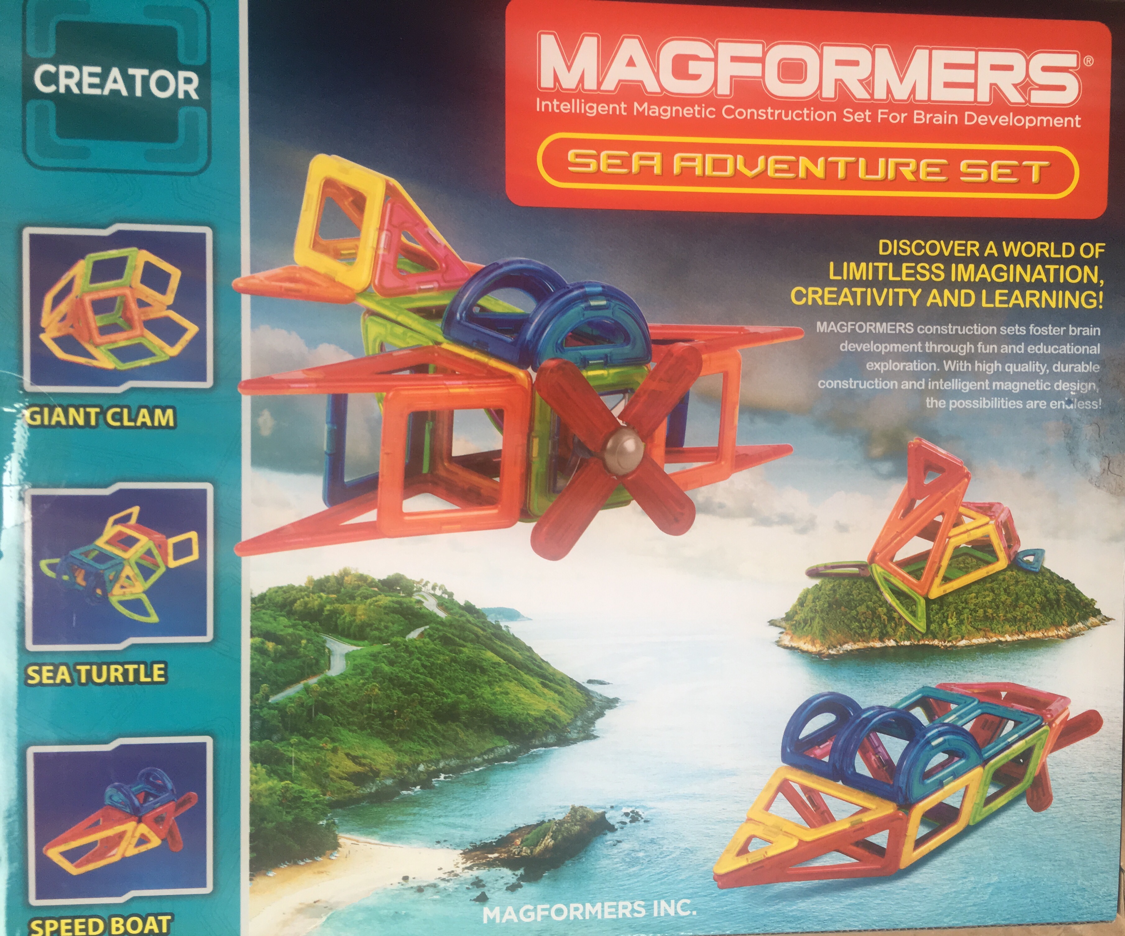 The Magformers Sea Adventure Set, contains 32 colourful Magformer pieces and an instruction booklet guiding children (and adults!) on how to build ocean themed animals and vehicles.