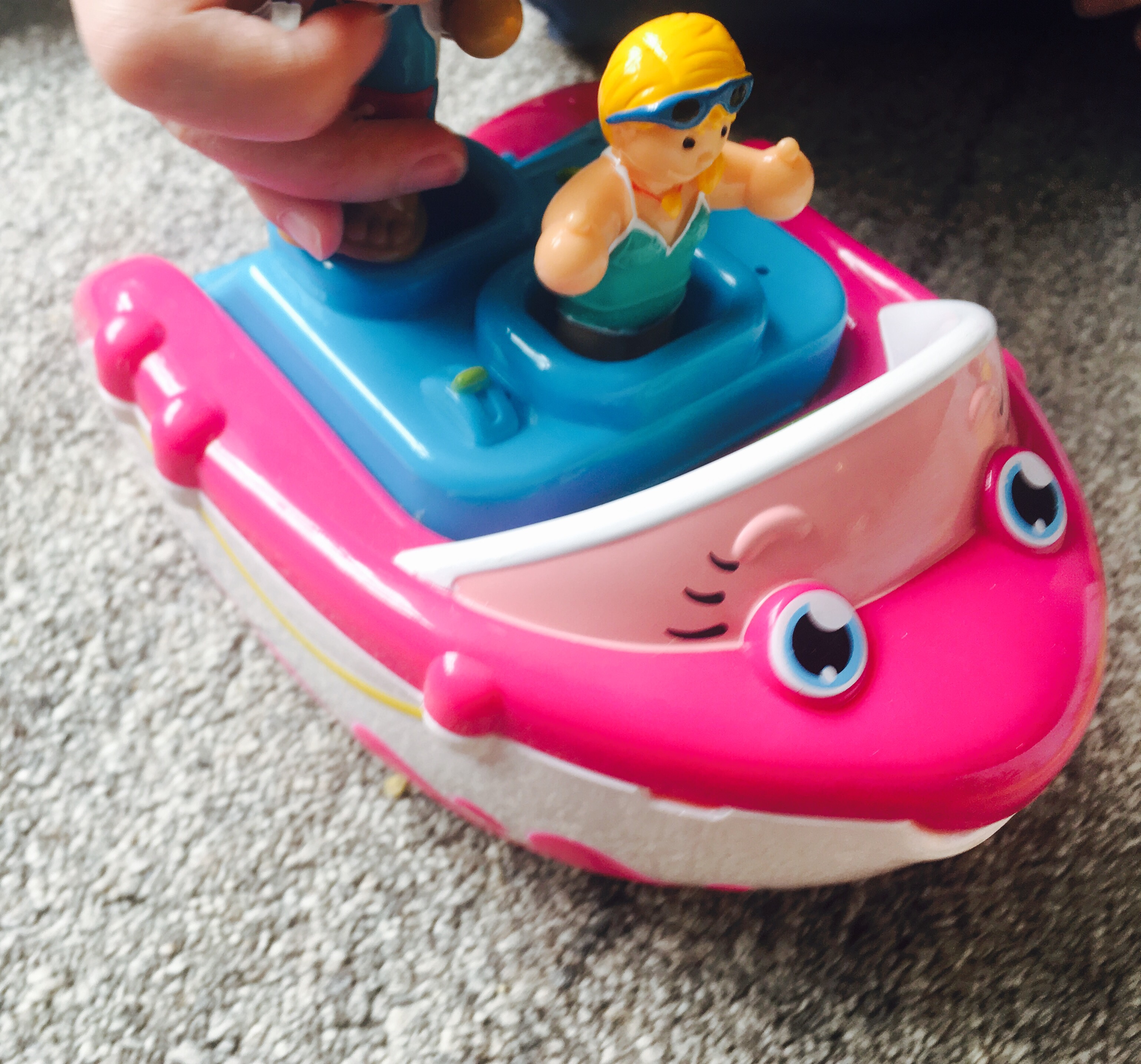 - Susie Speed Boat Opens Up-We thought Susie Speedboat was a pretty good toy with it’s adorable design and accompanying sea animals, but when we discovered it opens up to reveal a secret cabin (with a table set for cake!) we were even more impressed. As Grandma explained to my little ones ‘like a Polly Pocket but without the small peices!’ And she’s right. There’s the magic of being able to open it up to reveal a secret space, but there’s no small pieces, making it safe and suitable for babies and young toddlers. It’s also fantastic in the bath, as it fills up with water then pours out of the purpose built hole in the front.