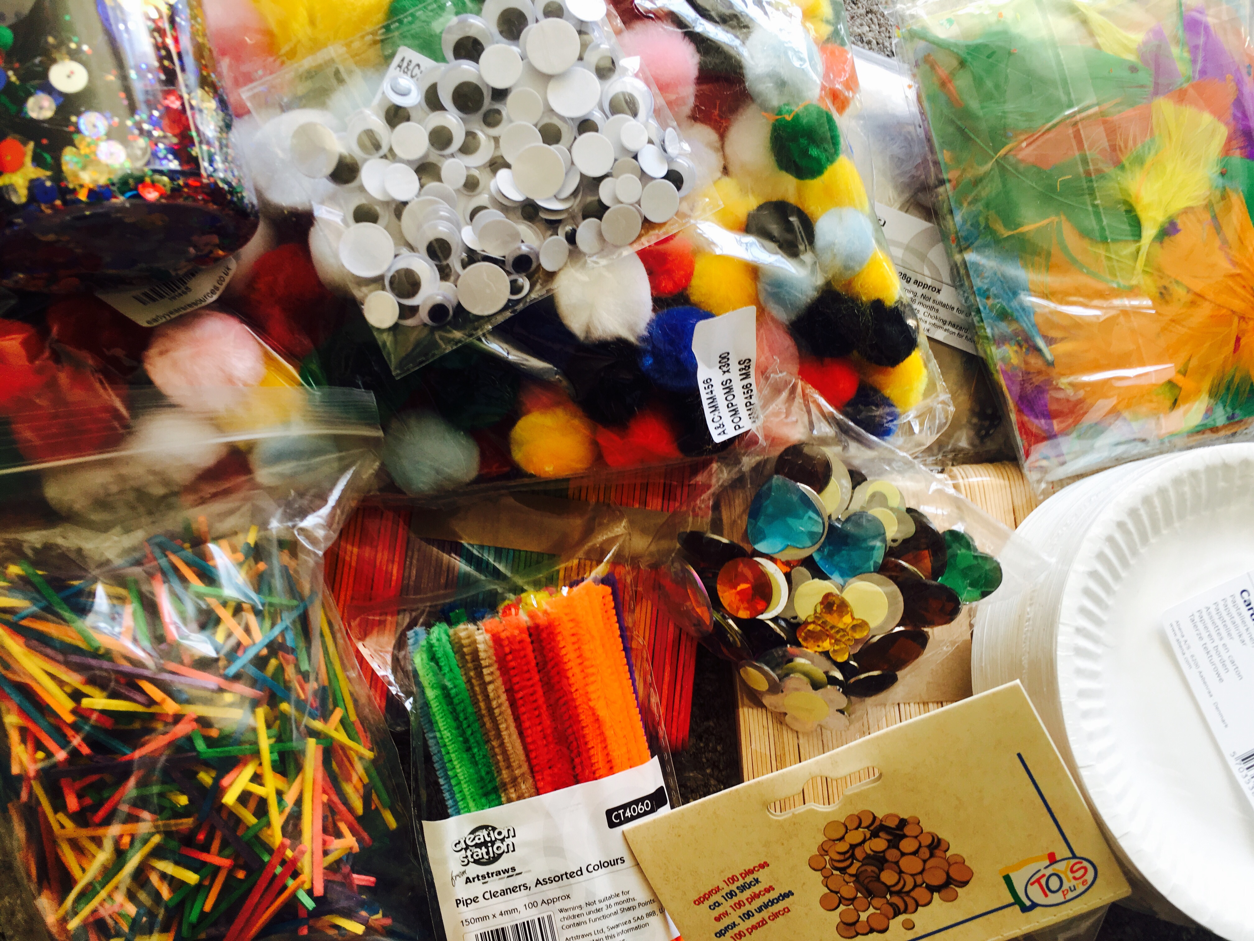 Their colourful, brilliant pack includes: pom poms, pipe cleaners, lolly sticks, googly eyes, coloured wooden matchsticks, tree slices, sequins, jewels, feathers and paper plates.