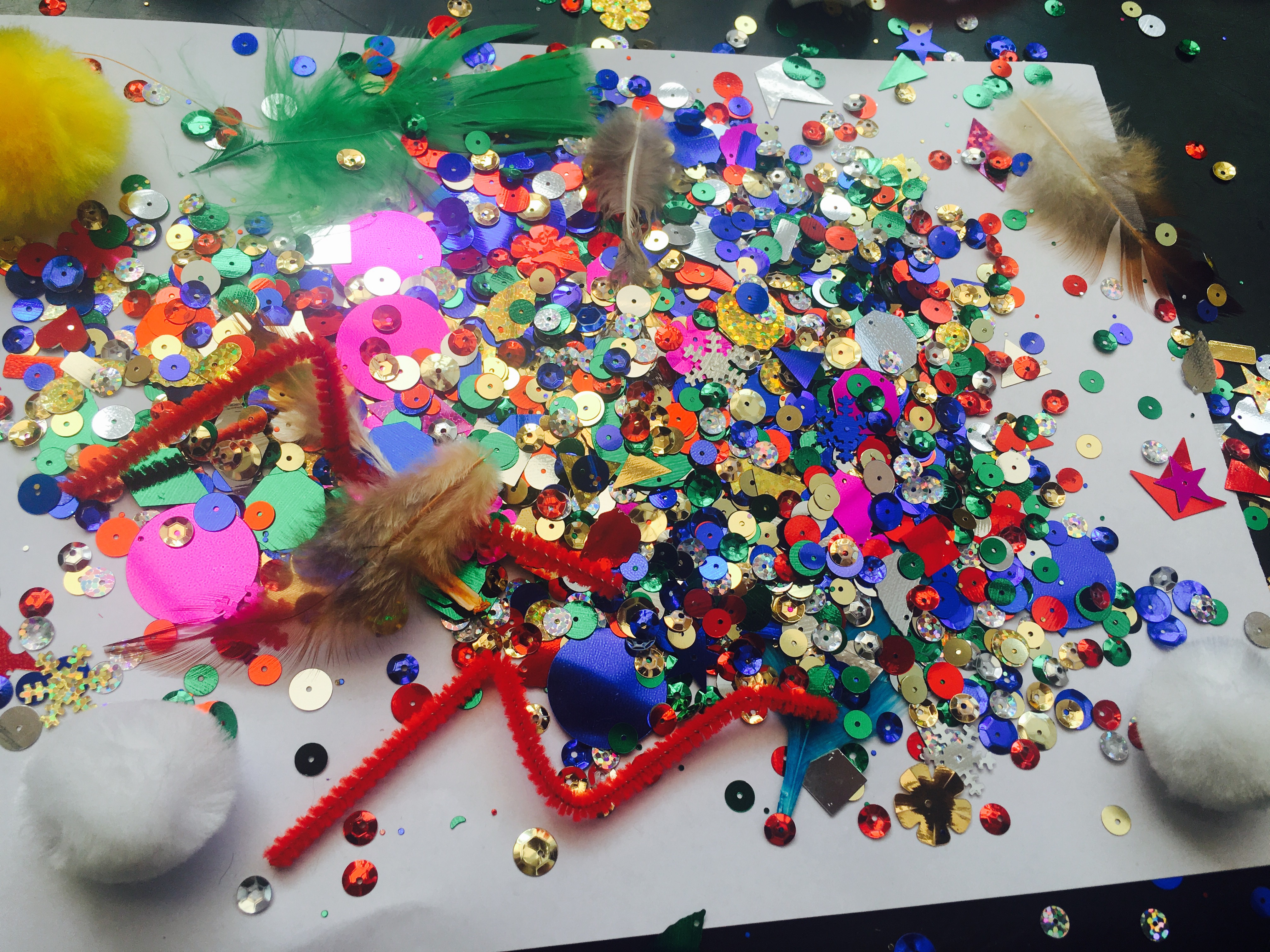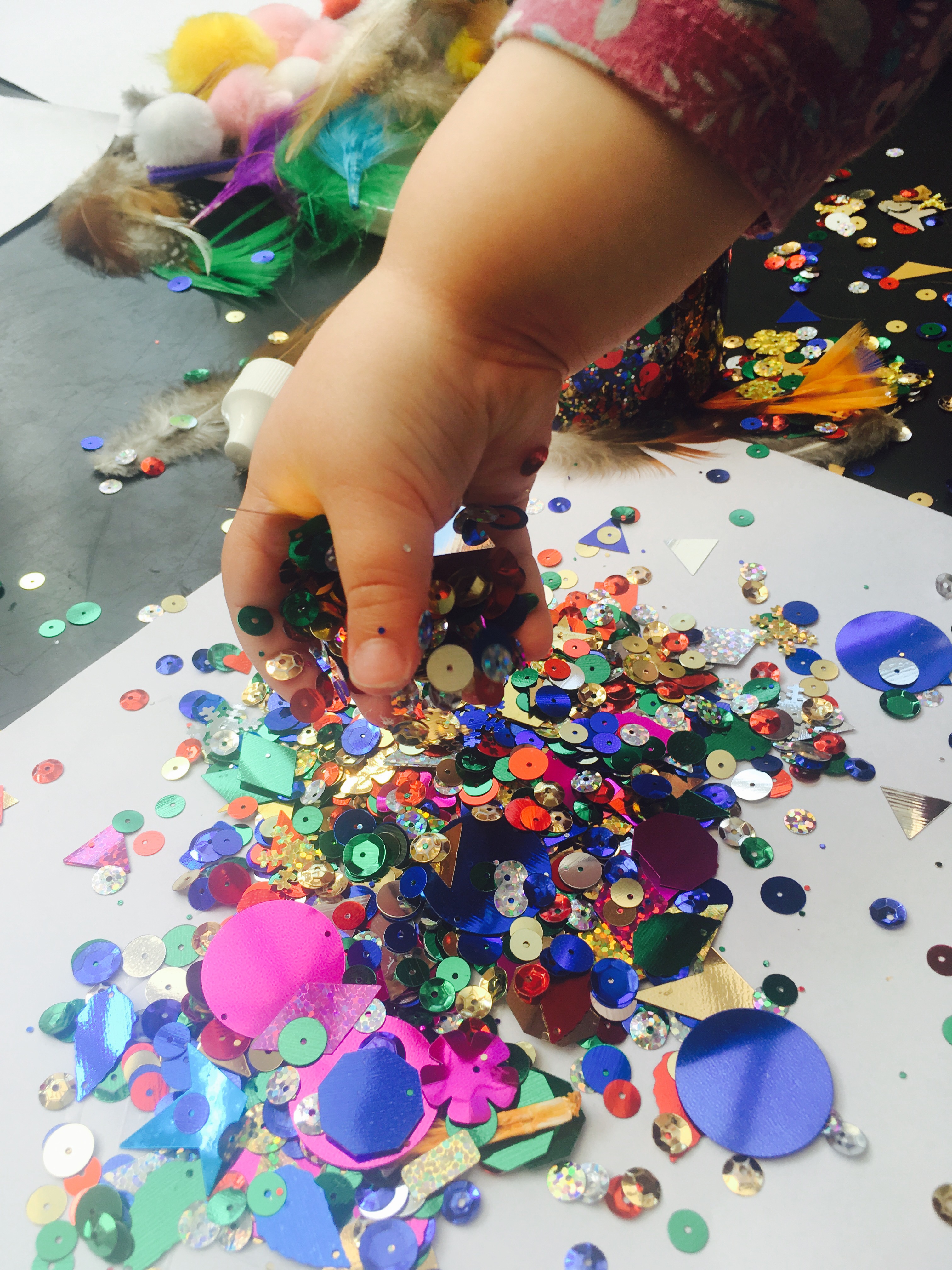 But I decided to put my fears of mess to one side and we got out the sequins, the Pom Poms, the pipe cleaners and feathers again and…it was brilliant! There was mess..but I had forgotten how much FUN collages are for children and the incredible array of skills they are learning when making a collage.