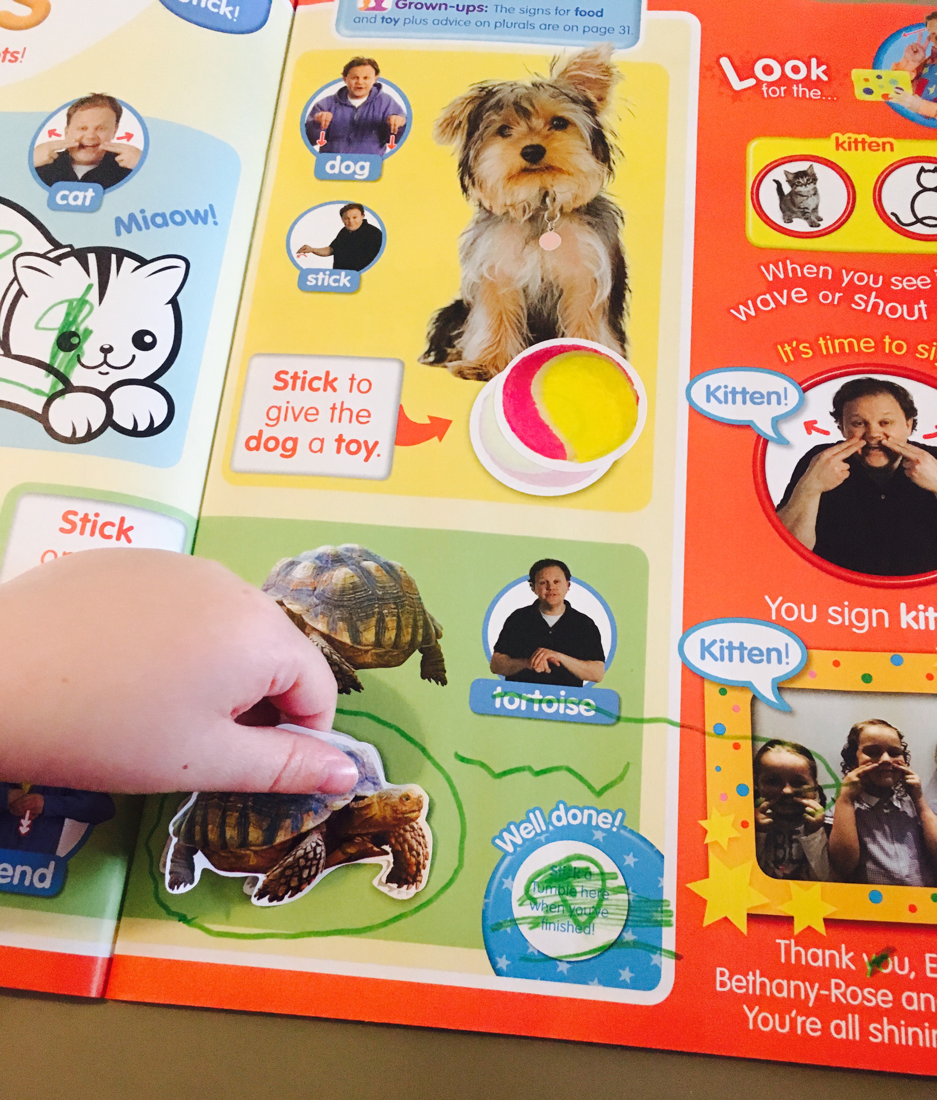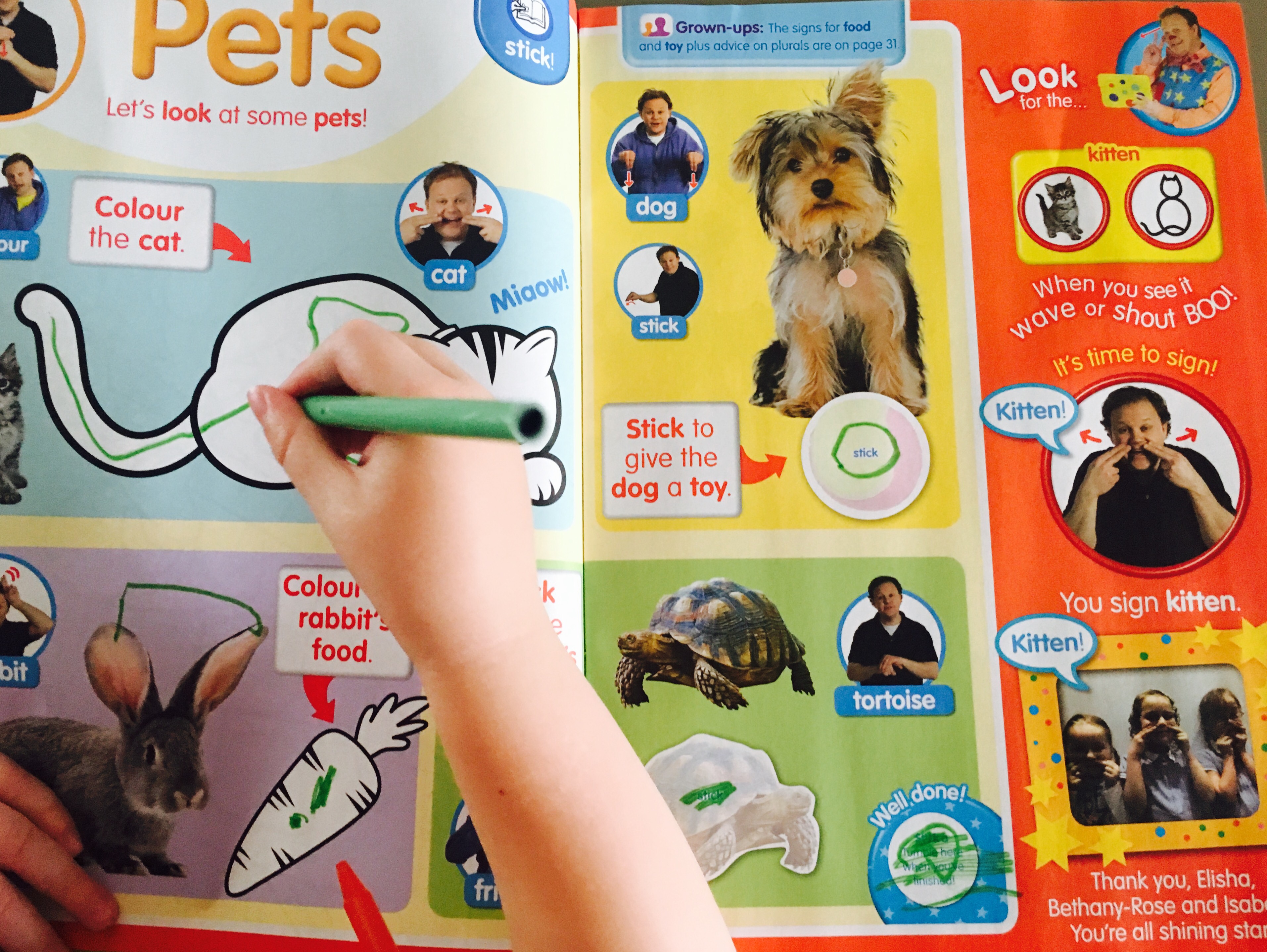 Our favourite activity in this month’s magazine was the sticker and colouring activity page all about pets; with it’s cute photographs of a cat, dog, rabbit and tortoise.