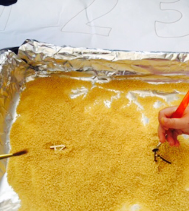 You could also write the numbers on the tray before filling with Cous Cous, and the children have to find the numbers written on the base and the wooden numbers and match them!