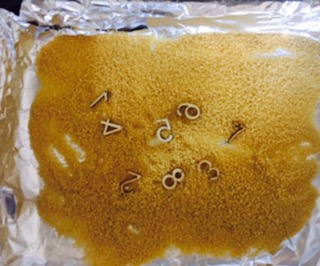 You could also write the numbers on the tray before filling with Cous Cous, and the children have to find the numbers written on the base and the wooden numbers and match them!