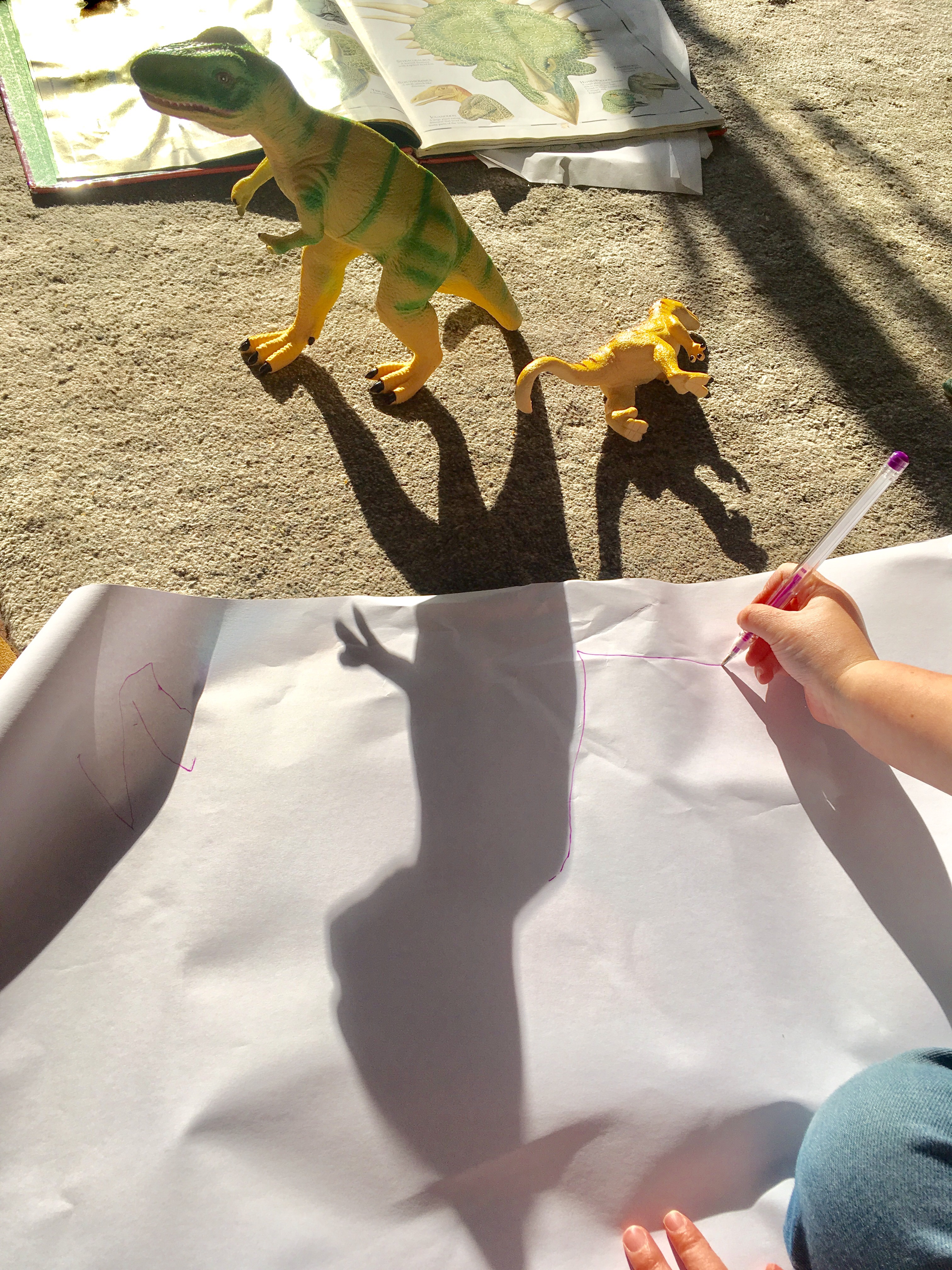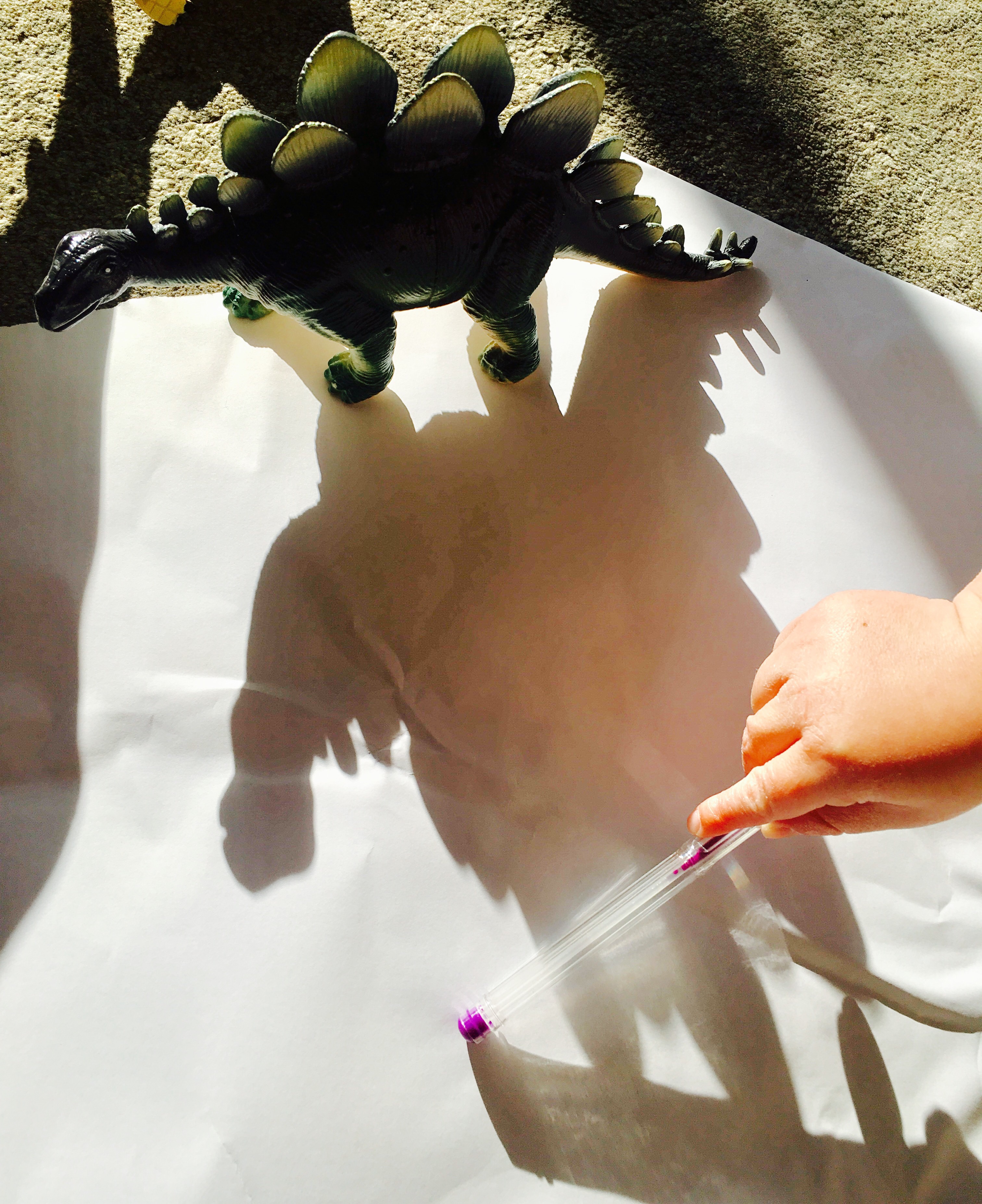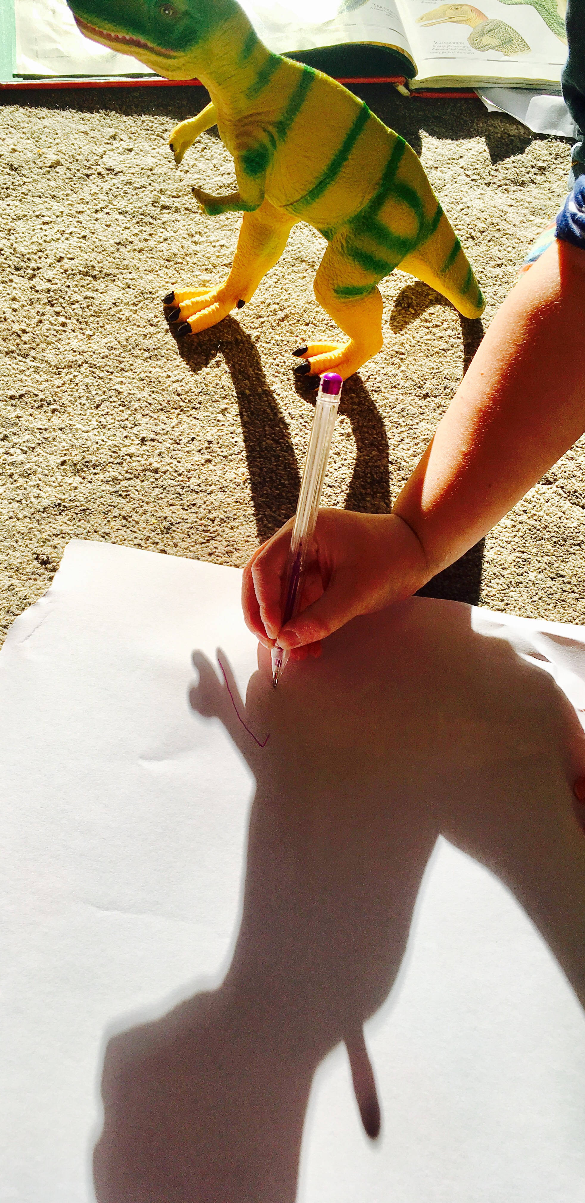 So simple- either choose a sunny day, use a torch or even a projector in a classroom – and put the peice of paper behind the toy dinosaur where the shadow is cast and draw round it!