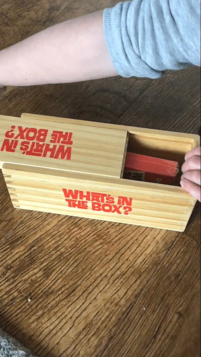 One player is ‘The box keeper’ and they are, as the name suggests, in charge of the box-choosing what to secretly put inside (card or real object) and keeping it safe from anyone who might cheat!