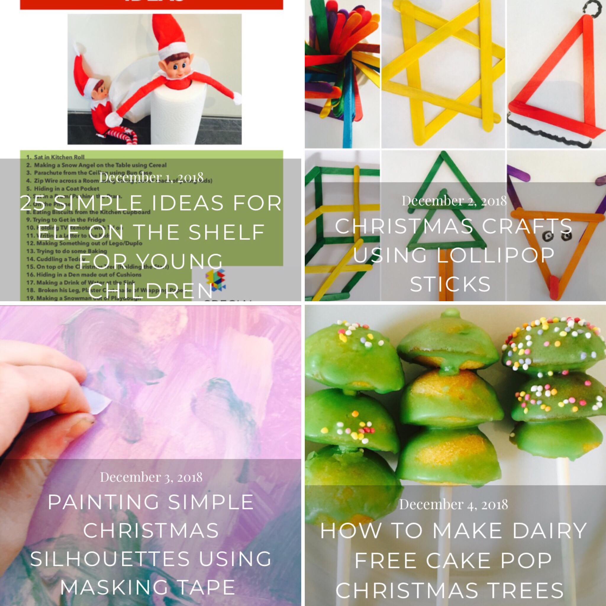 So far we’ve learn about or Elf on the Shelf (see our handy list of Elf on The Shelf Ideas here), we’ve made pictures using lollipop Sticks, painted Christmas silhouettes using masking tape and made Dairy Free Christmas Tree Cake Pops (yum!).