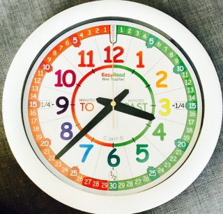 The EasyRead Time Teacher clock’s main difference from other clocks is that it comprises of two different coloured halves. One half has all the minutes past the hour (up to 30) printed on it. And the other half has all the minutes to the hour printed on it.