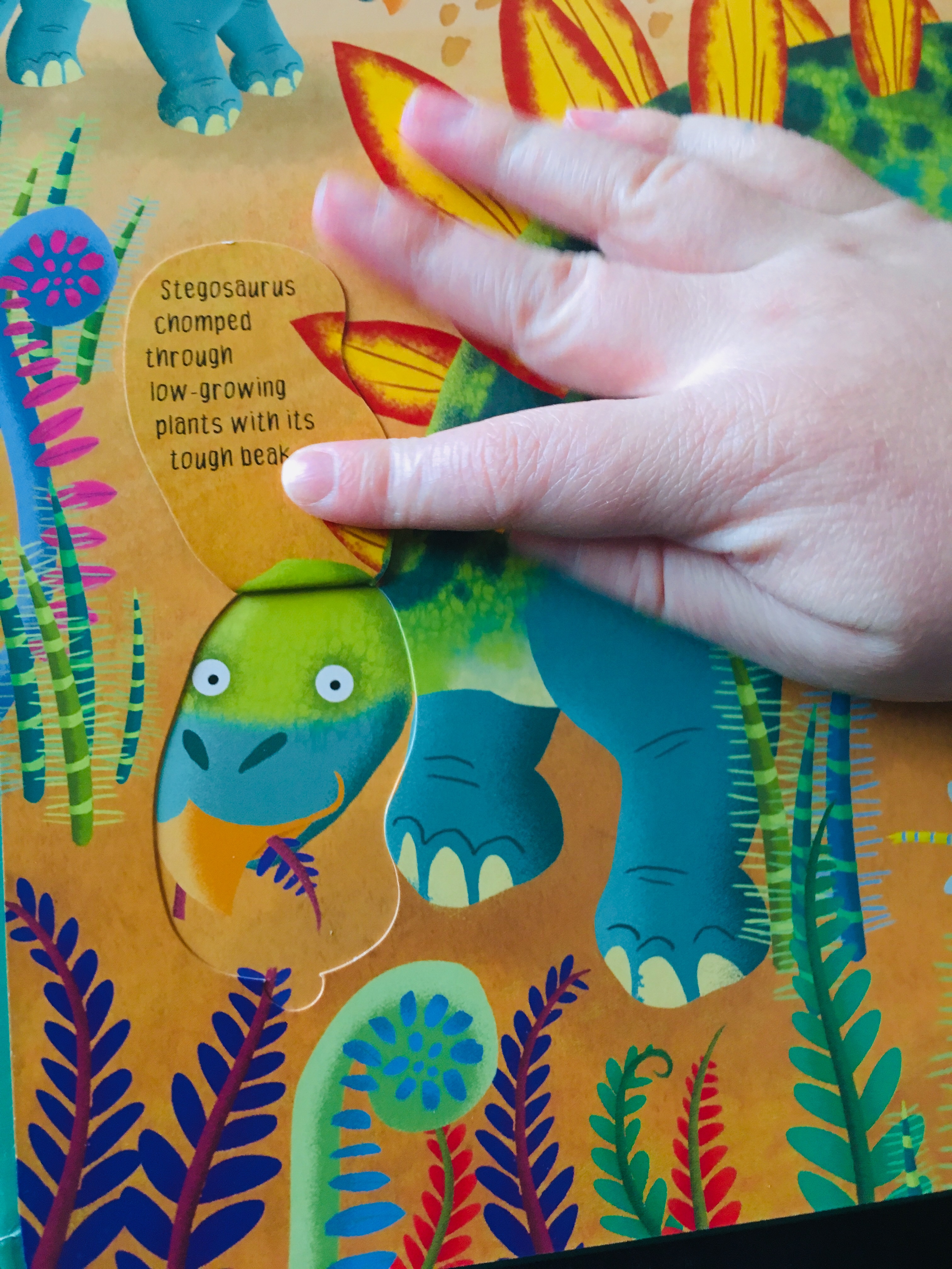 Example of same page with flaps open- Interactive– We love that this book is interactive. Each page is dotted with lots of well hidden lift the flaps to discover, keeping children’s interest and intrigue. Some of the flaps reveal interesting information whilst others change the way the pictures look, or make the dinosaurs look like they move/change expression. The dinosaur fossil hunt page for example, fuels children’s imaginations- helping them to imagine they are taking part in a fossil dig and lifting the flaps to discover dinosaur skeletons!