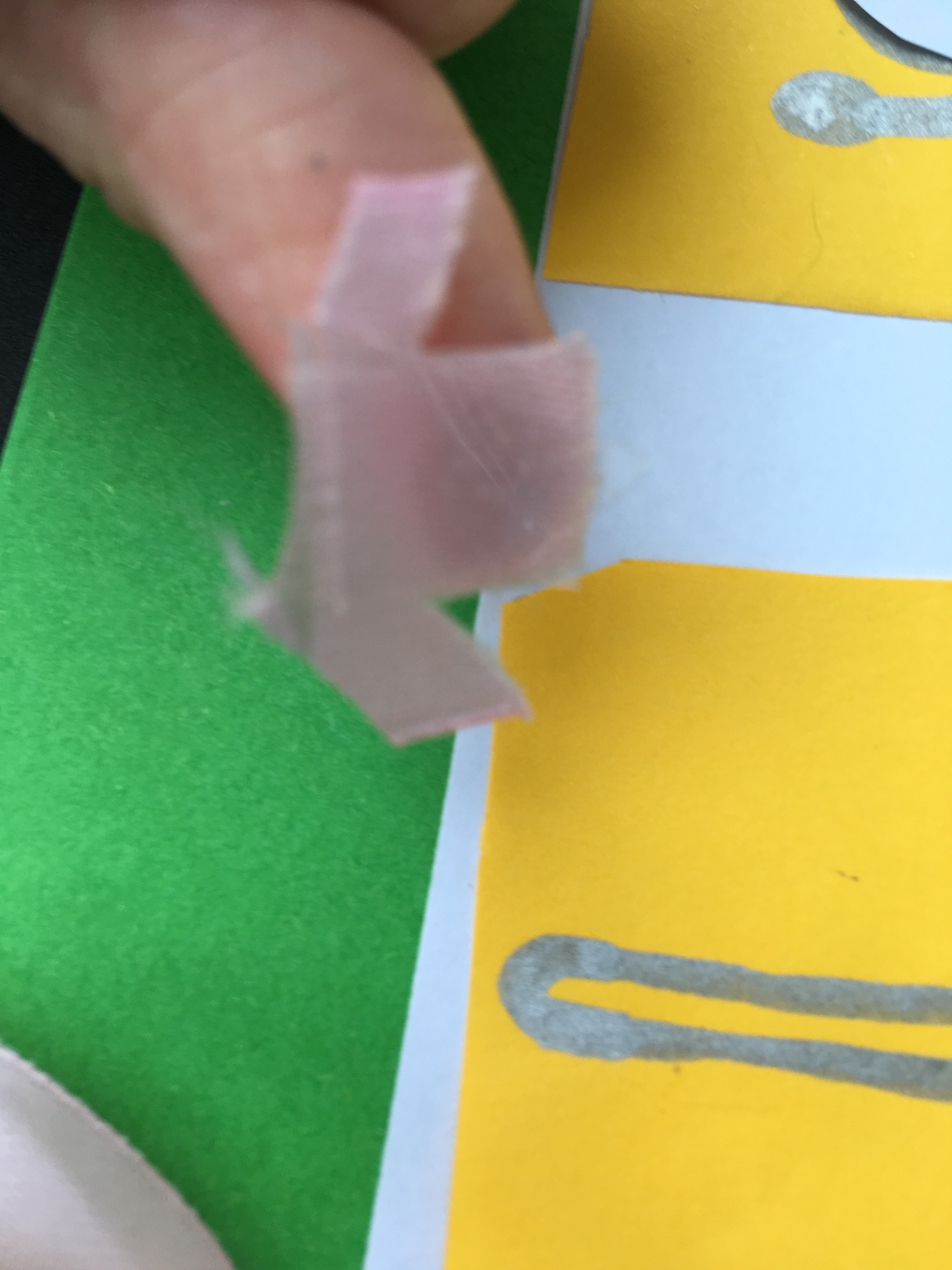 - Here’s the fun bit- get the children thinking about the materials they could use for each part of the routine. For example, we chose ribbon for the picture of the school shirt so it was nice and smooth. And cut up wooden sticks and glued them down to make bumpy porridge: we also use foil for the spoon. We chose to stick them down using the Bostik Microdots.