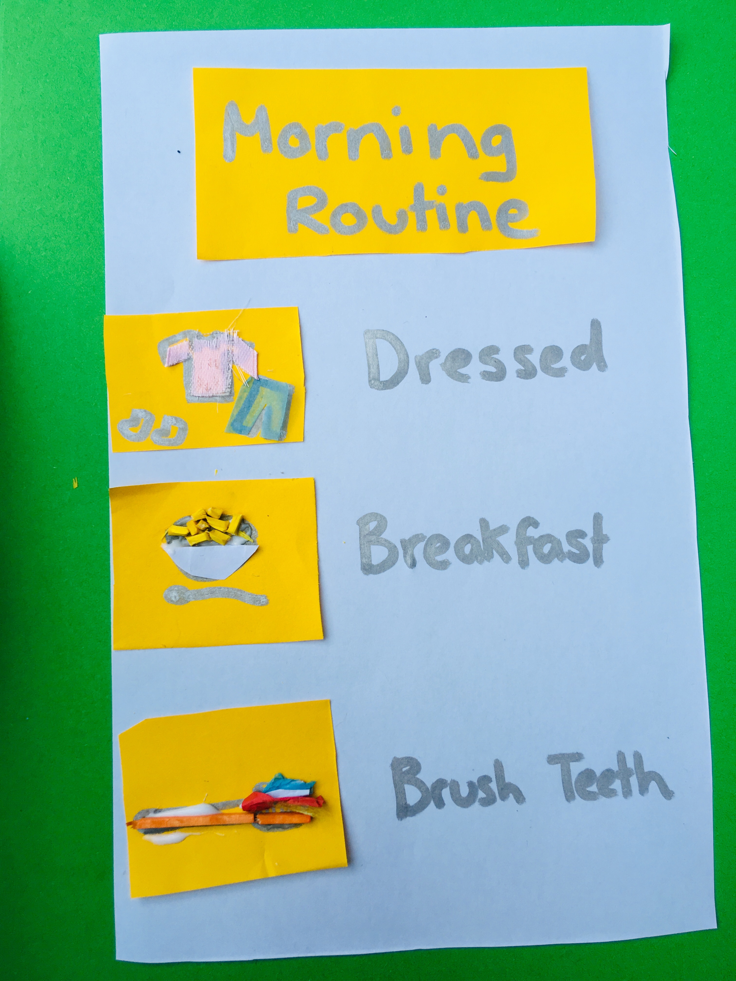 - Opportunity to discuss the routine whilst creating the chart- we enjoyed having an informal chat about how our mornings would be when school begins. It allowed the children time to process the change from the summer holidays and think about and verbalise any concerns.