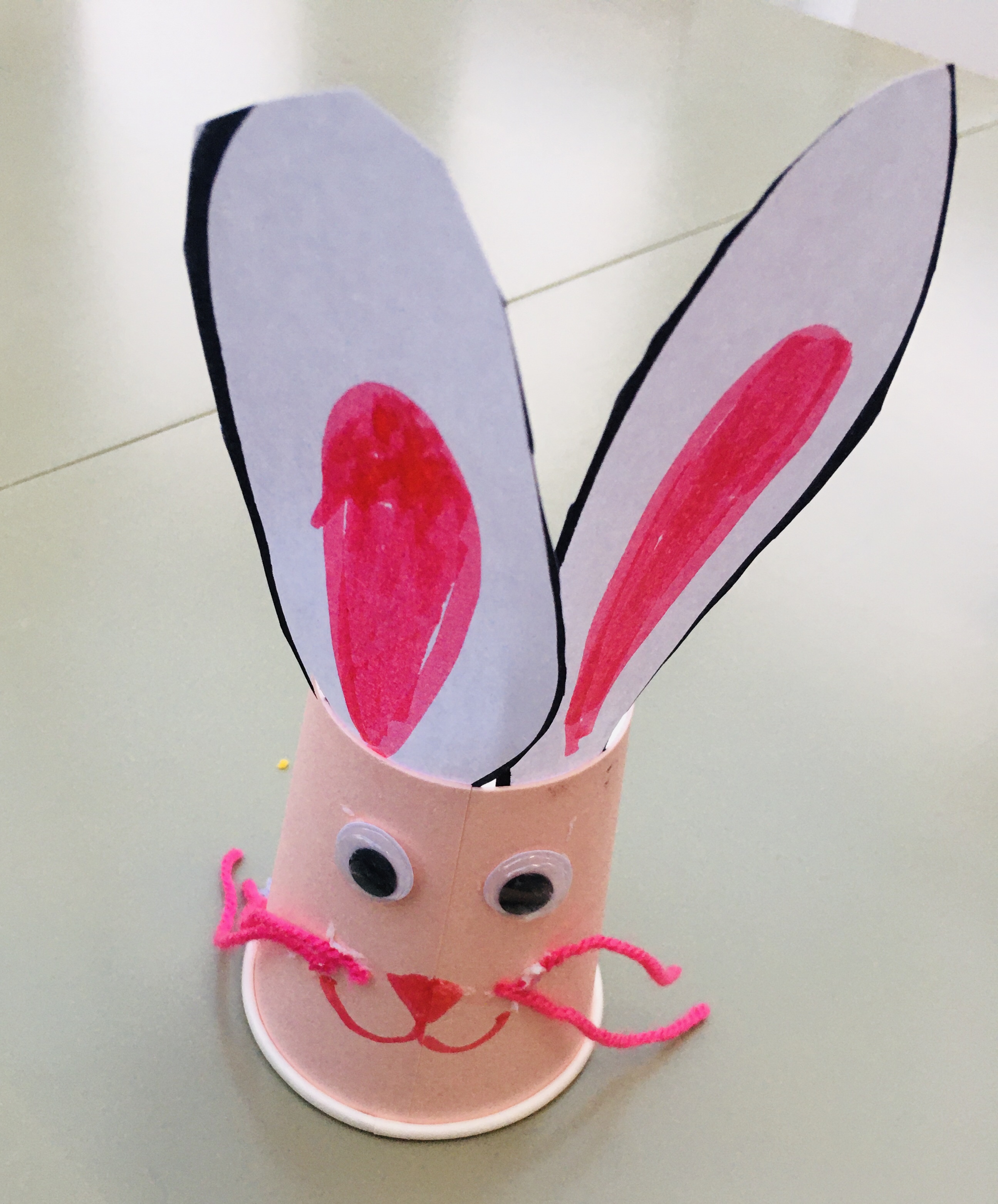 - Draw two ears, colour their centre in pink and stick onto the top of the cup.