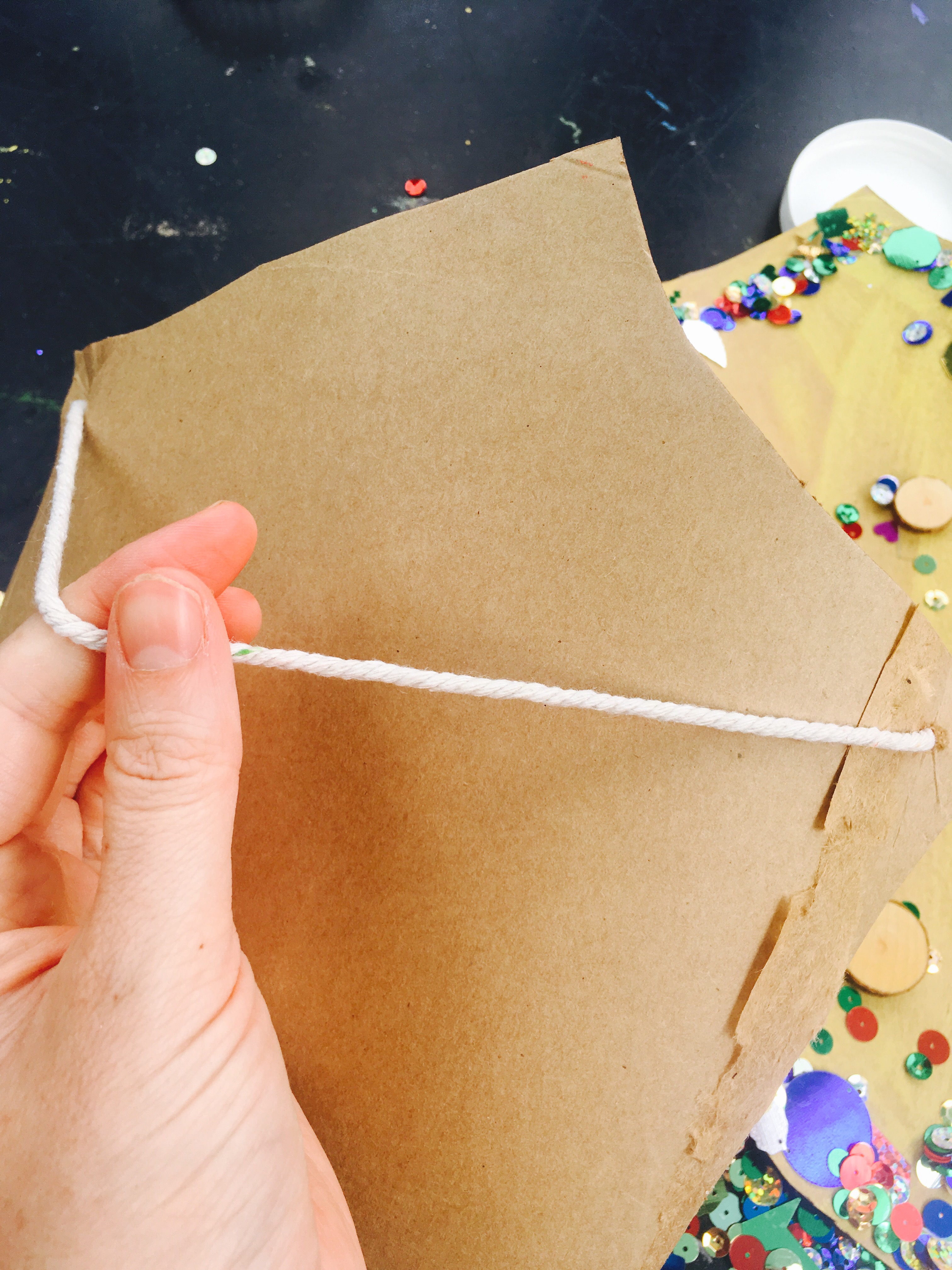 - Thread string through and tie a knot at both ends. This will make the handle.