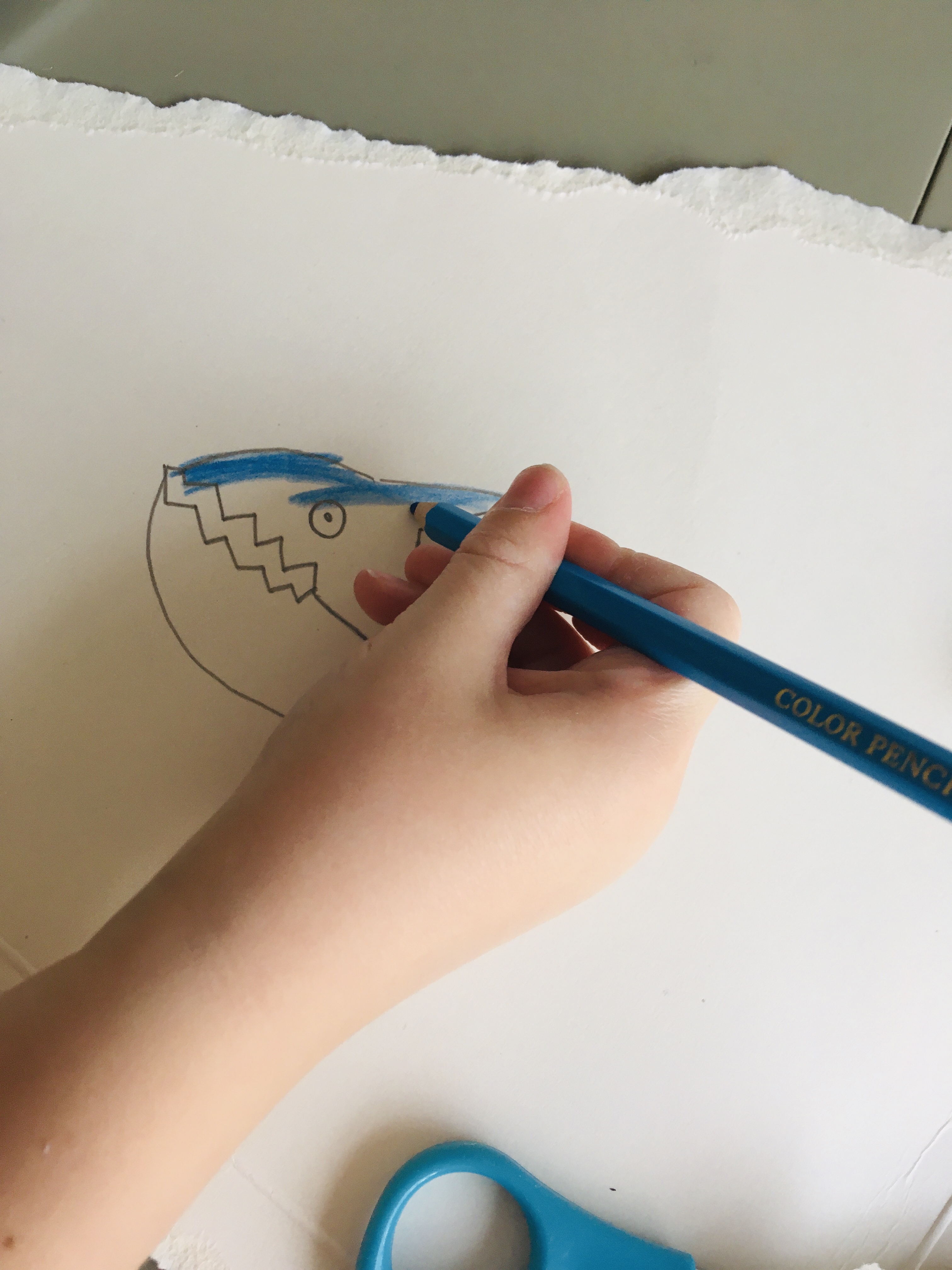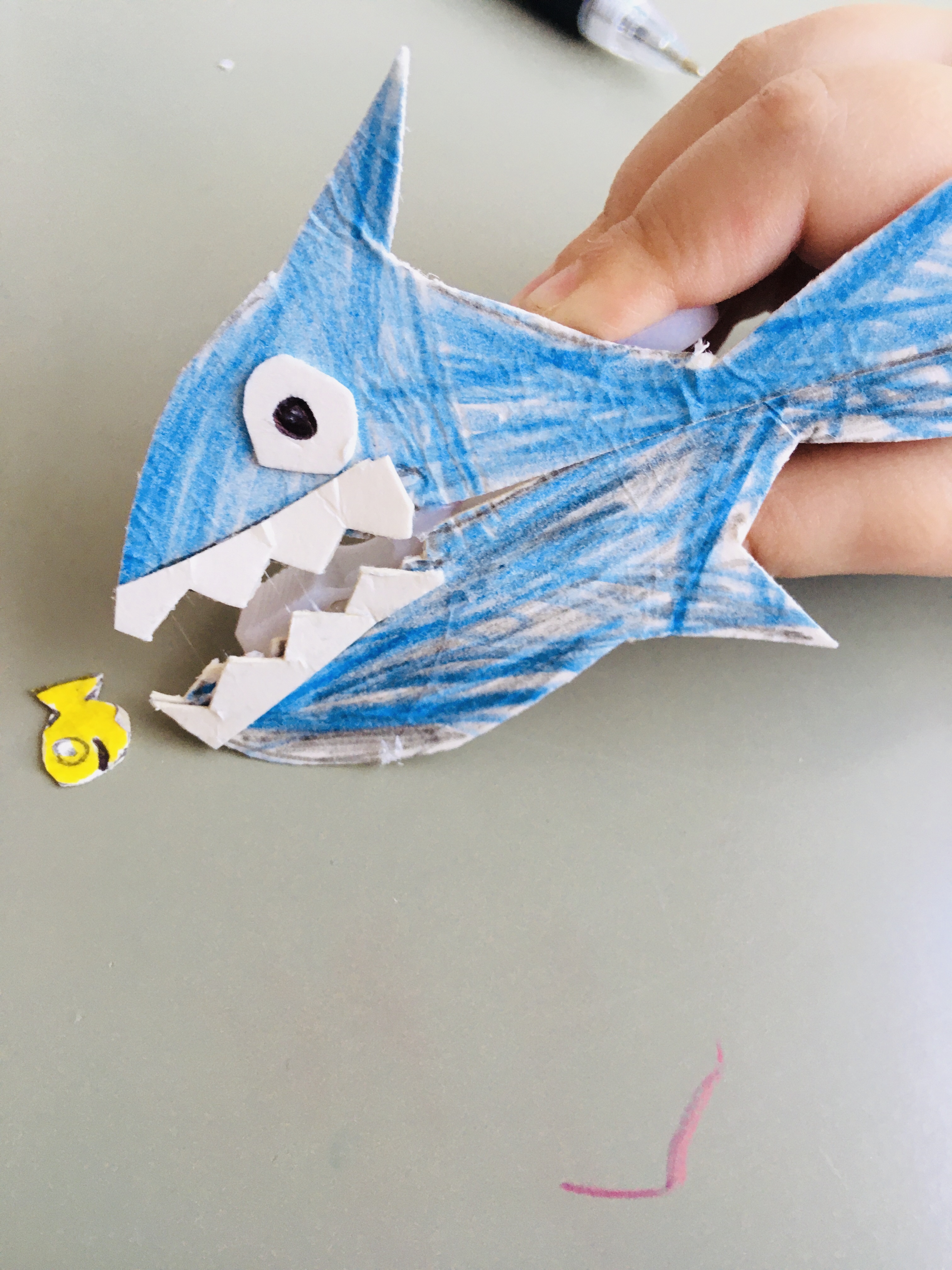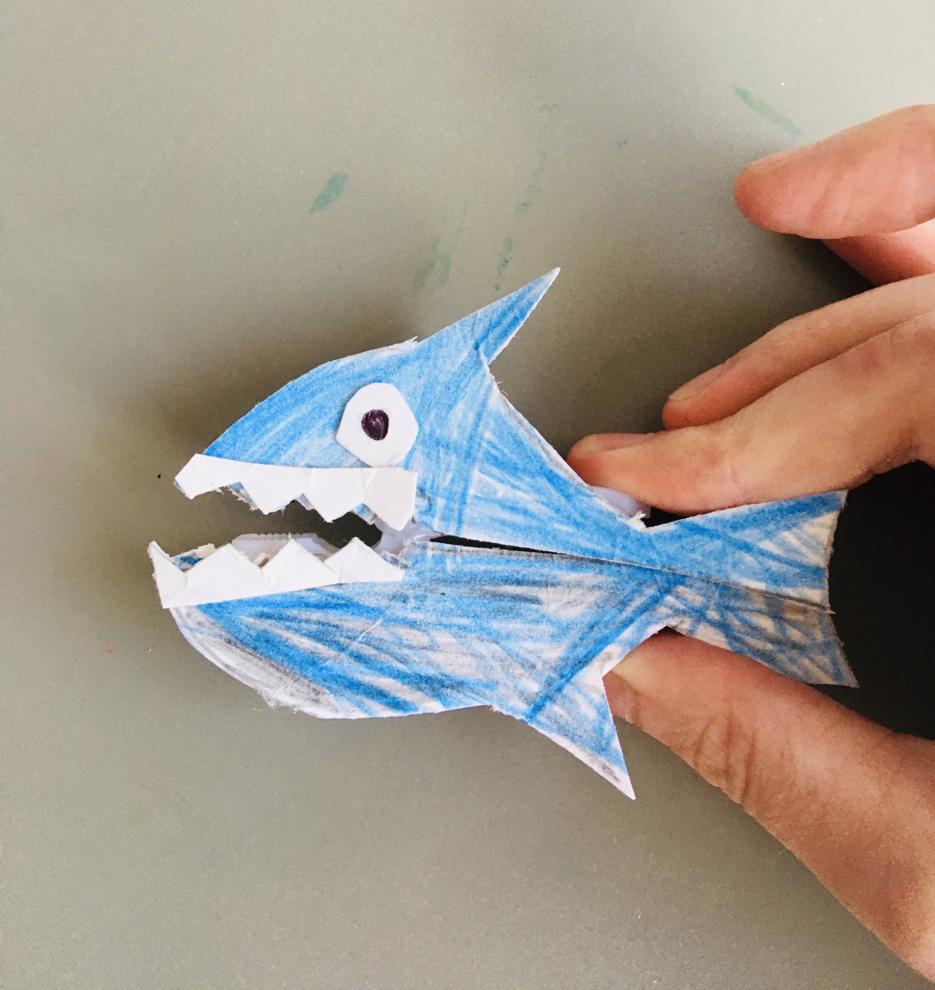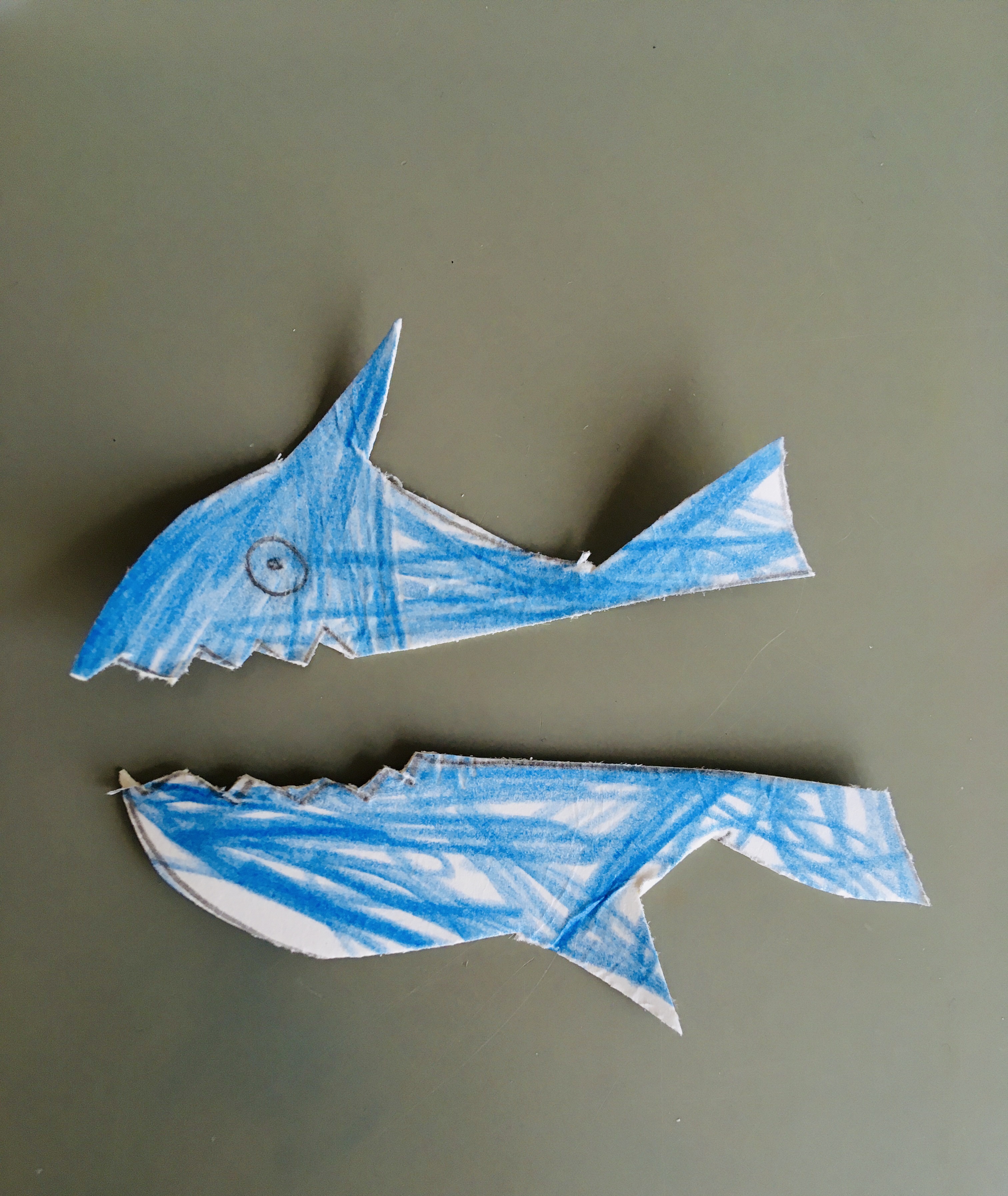1. Help your child to draw a shark on some card (making it just a bit bigger than the peg) and colour it in.