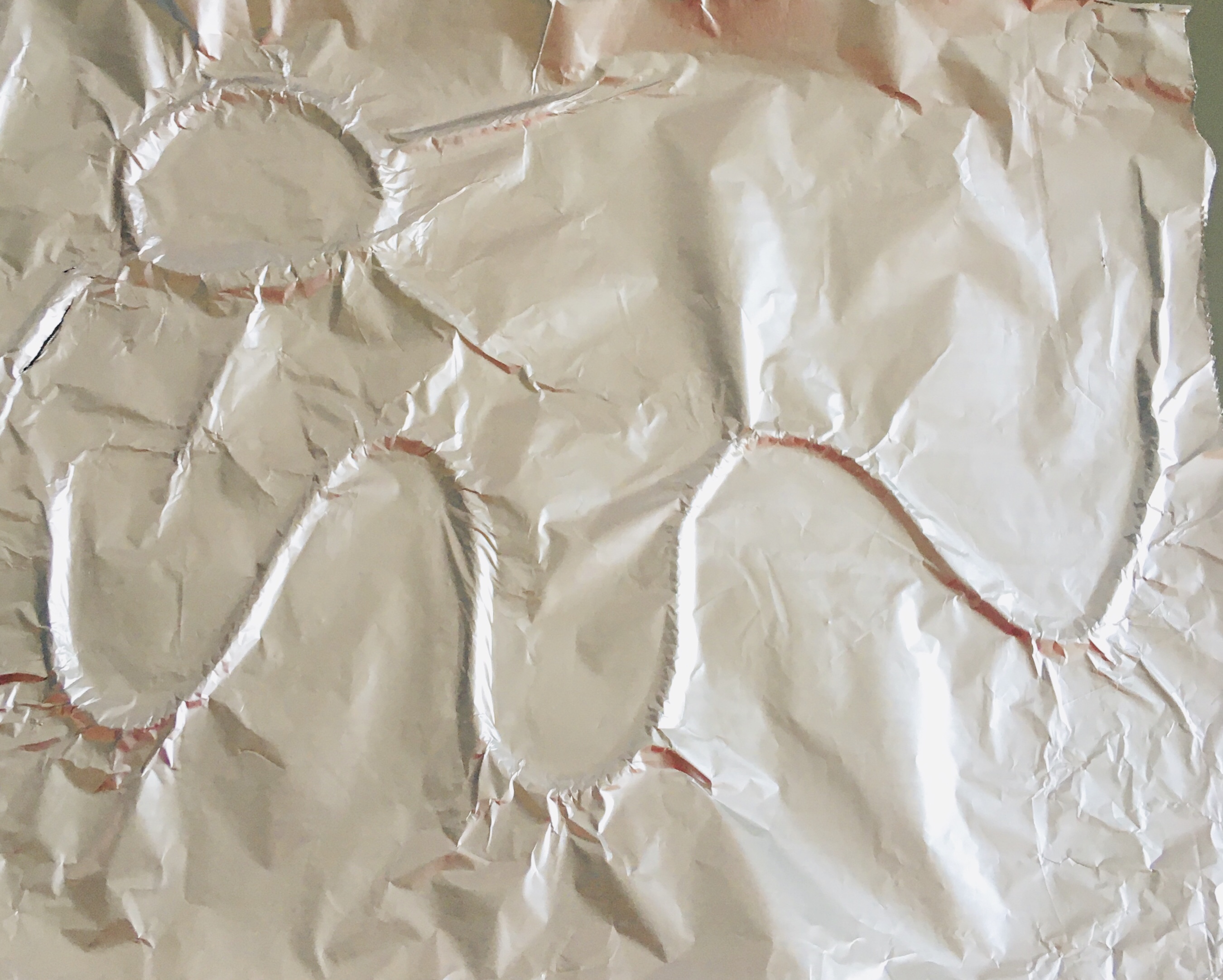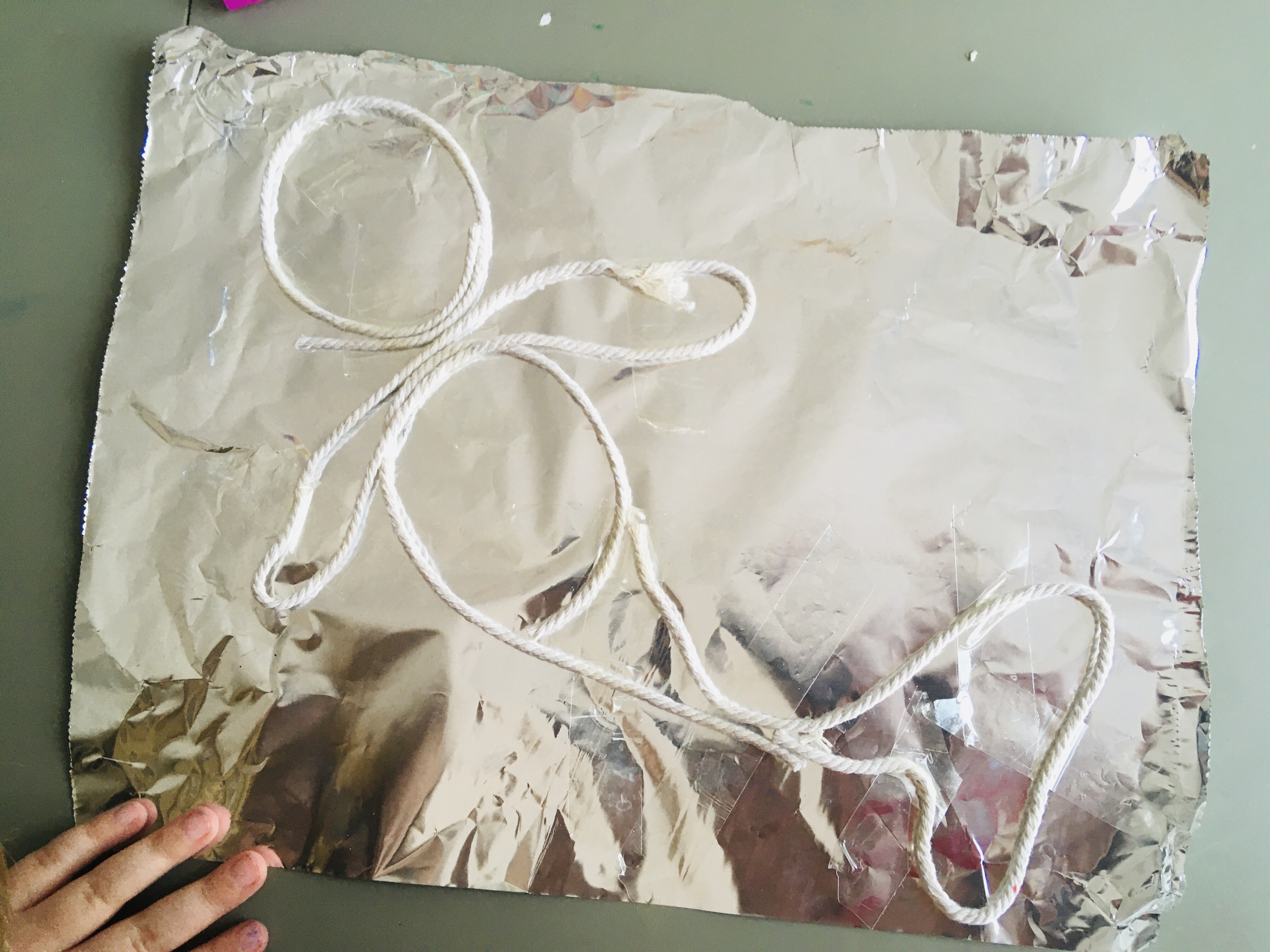 2. Turn the foil over, gently press the foil down so that it goes down where there’s no string underneath and is raised where there is string underneath.