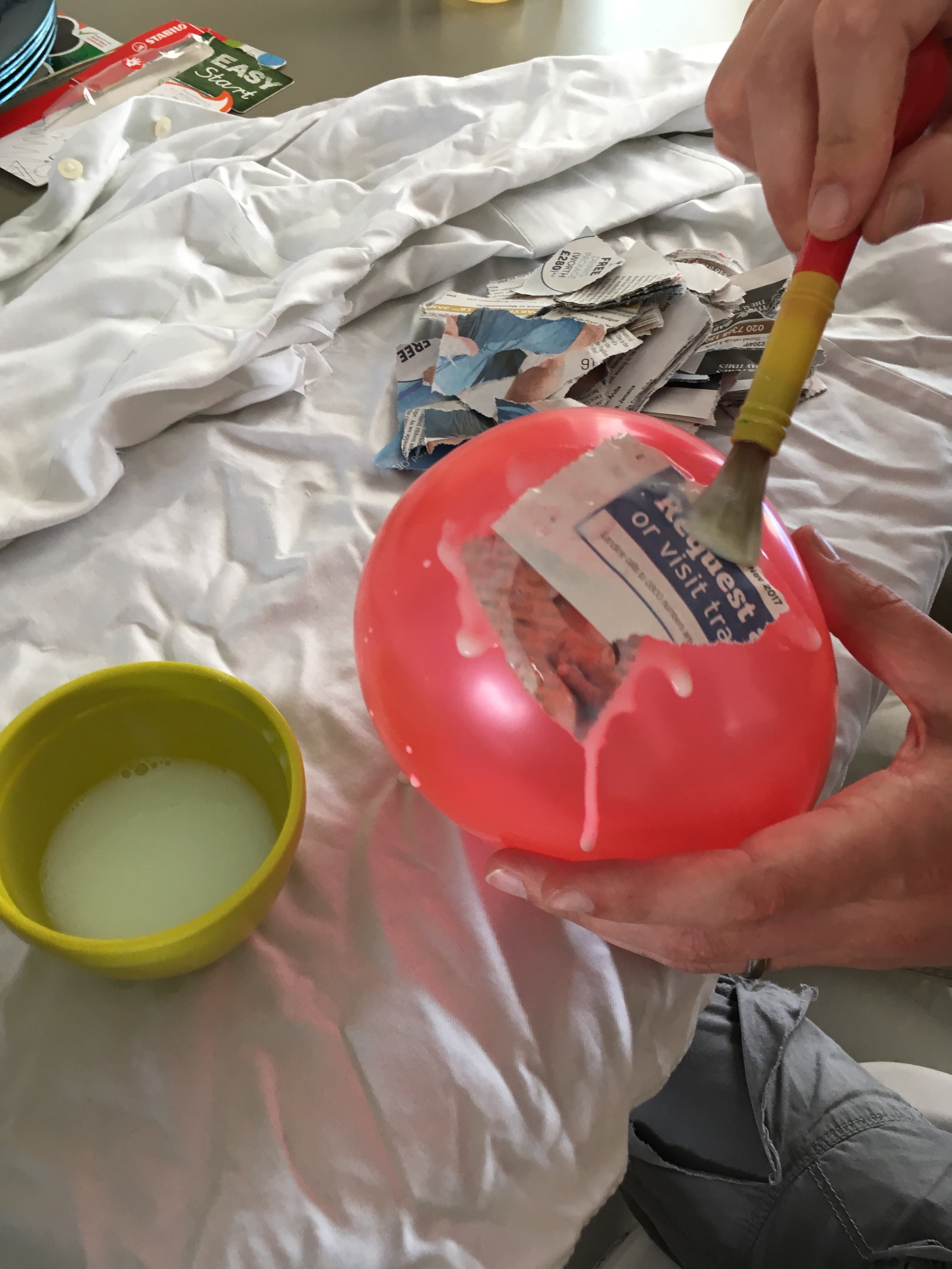 Step 1: Blow up a balloon. Mix pva glue and water together. Put the strips of newspaper/paper on the balloon and cover in the glue/water solution.
