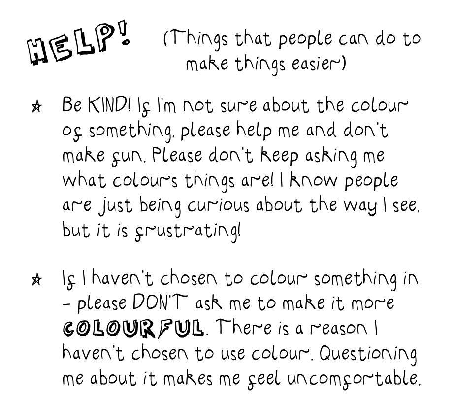 - Provides useful tips for families and teachers– Woven into the book are some fantastic strategies and tips for helping children with colourblindness. Malachi provides lots of examples of how it effects him and simple ways that can help. As a former SENDCO and private tutor for children with Special Educational Needs, I thought I knew a fair bit about colour blindness before reading his book, but I’ve genuinely learnt quite a bit. I’ve learnt practical things such as that for some children with colourblindness, knowing if a banana or strawberry is ripe- can be really tricky. And also knowing if batteries are charged when the red and green lights are used, can also pose a challenge. I also found the ‘Help’ section really useful, it’s so helpful to see it from the point of view of a child and what they think teachers/friends/family could do to make things easier.