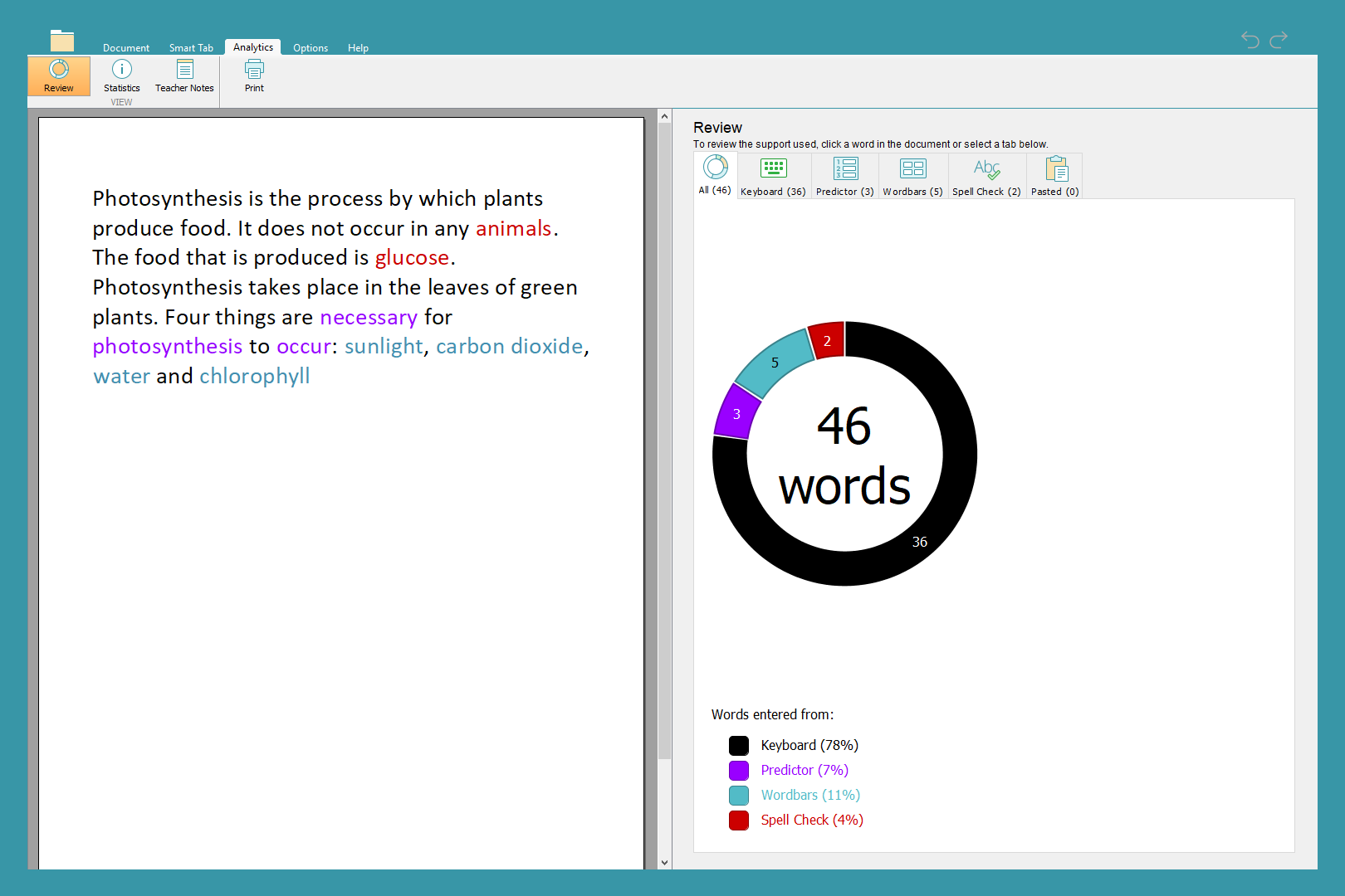 – Analytics feature – One thing that concerned me about DocsPlus was how would you know what the students in your class found difficult or needed to work on, if all the extra support meant their finished document was perfect? How would you know that they had needed help with the spelling of certain words, or needed to use the speech help? Thankfully, I discovered that DocsPlus is about 10 steps ahead on this! Their new feature allows teachers to understand how students writing has come together to work out what support was needed. It basically tracks what they have been doing, spell checking etc. and then tells you about it in a really well presented way (graphs!). It tells you how many words they wrote independently, how many words they used the predictor to input, how many words from word bars and how many from spell checker (as a percentage). You can also see how they wrote certain words the first time (so you can spot common errors) and see if they used speech help.