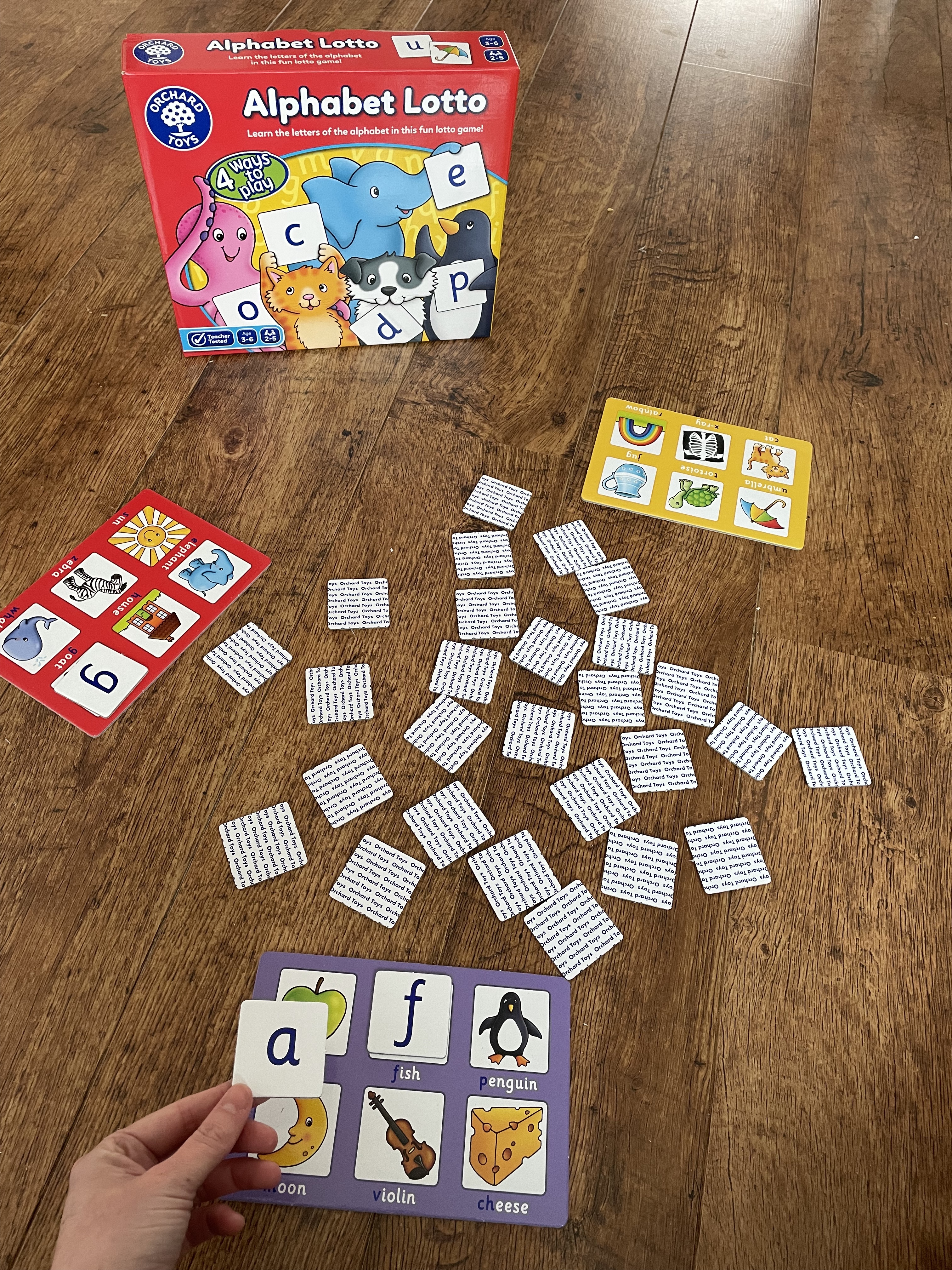 Alphabet Lotto – This game is one of my absolute favourites and I’d argue it’s one of a lot of children’s favourites too! A genuinely fun, family game that helps develop literacy skills. There’s four ways to play it, which like the flashcards, gives it longevity as you can use it for a wide range of abilities and ages. One way is to use it to help learn the letters of the alphabet – great for children at the start of their literacy journey. Everyone gets a board with 6 letters/digraphs on, you take it in turns to choose a tile (that’s face down in the centre) and if you have that letter on your board you can keep the tile. First person to get all 6 – wins! This is a lovely way of helping children to recognise letters, it’s also fantastic for memory skills. My favourite way of playing it, is to use it to help children learn the initial letter sounds of a word – that is to say, the letter sound the word begins with..so for ‘hat’ it would be ‘h’ and for ‘church’ is would be ‘ch’. To do this, they start with the board with the letters/letter sounds on and play the same game but this time match the pictures to the correct letter. This is great for speech and language skills too!